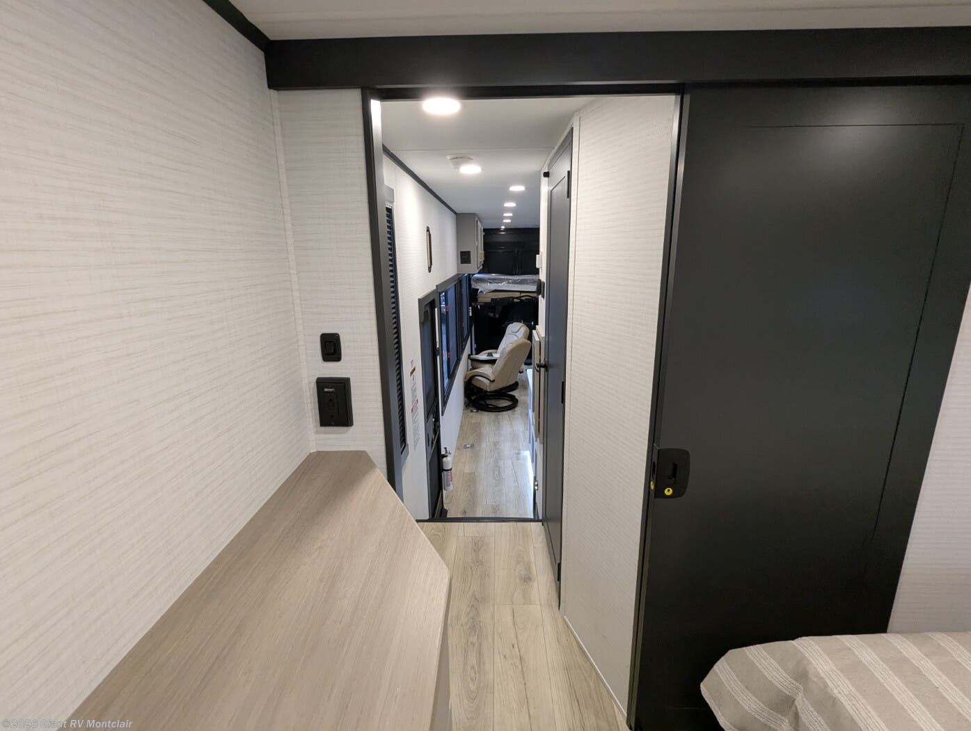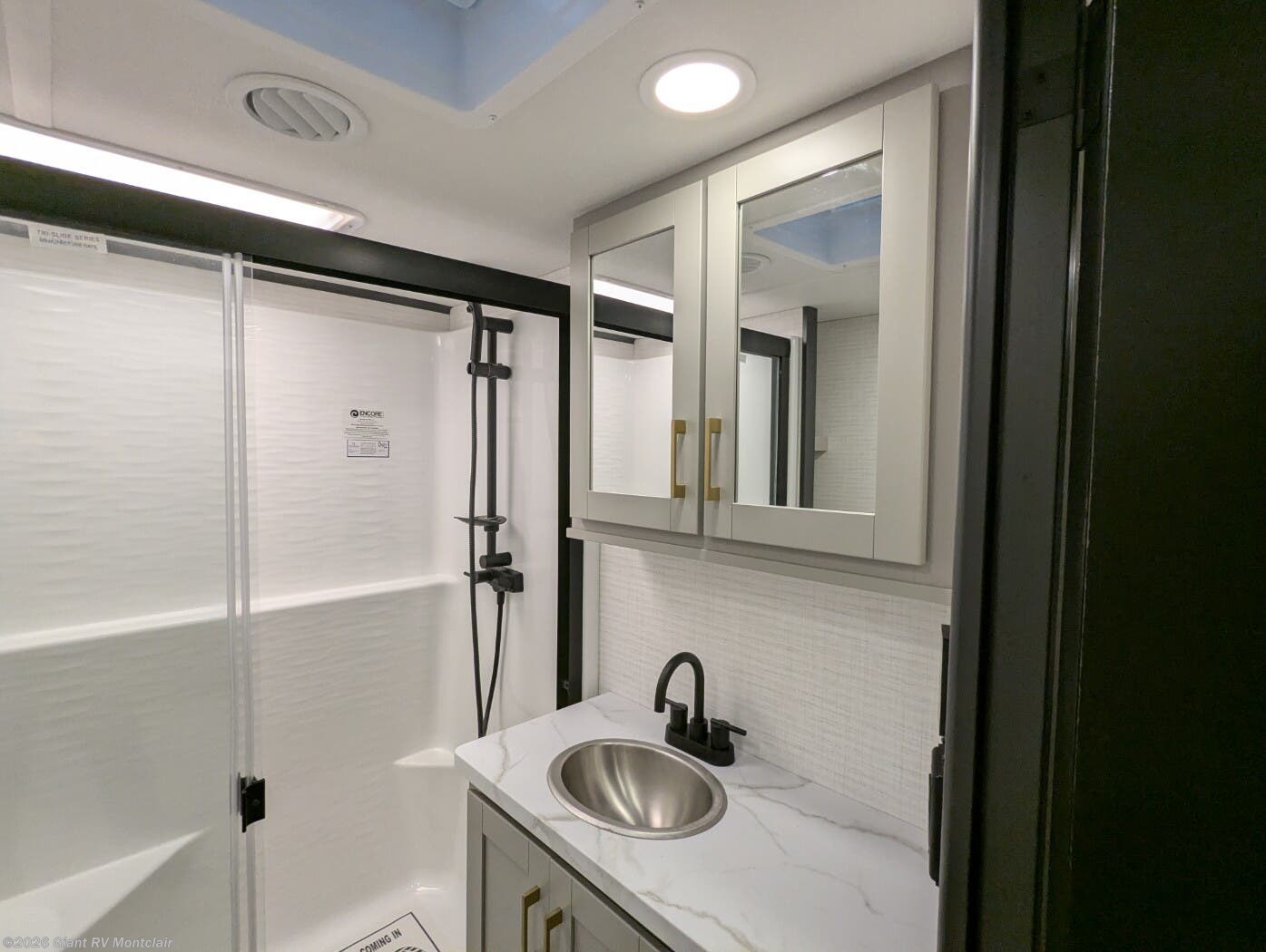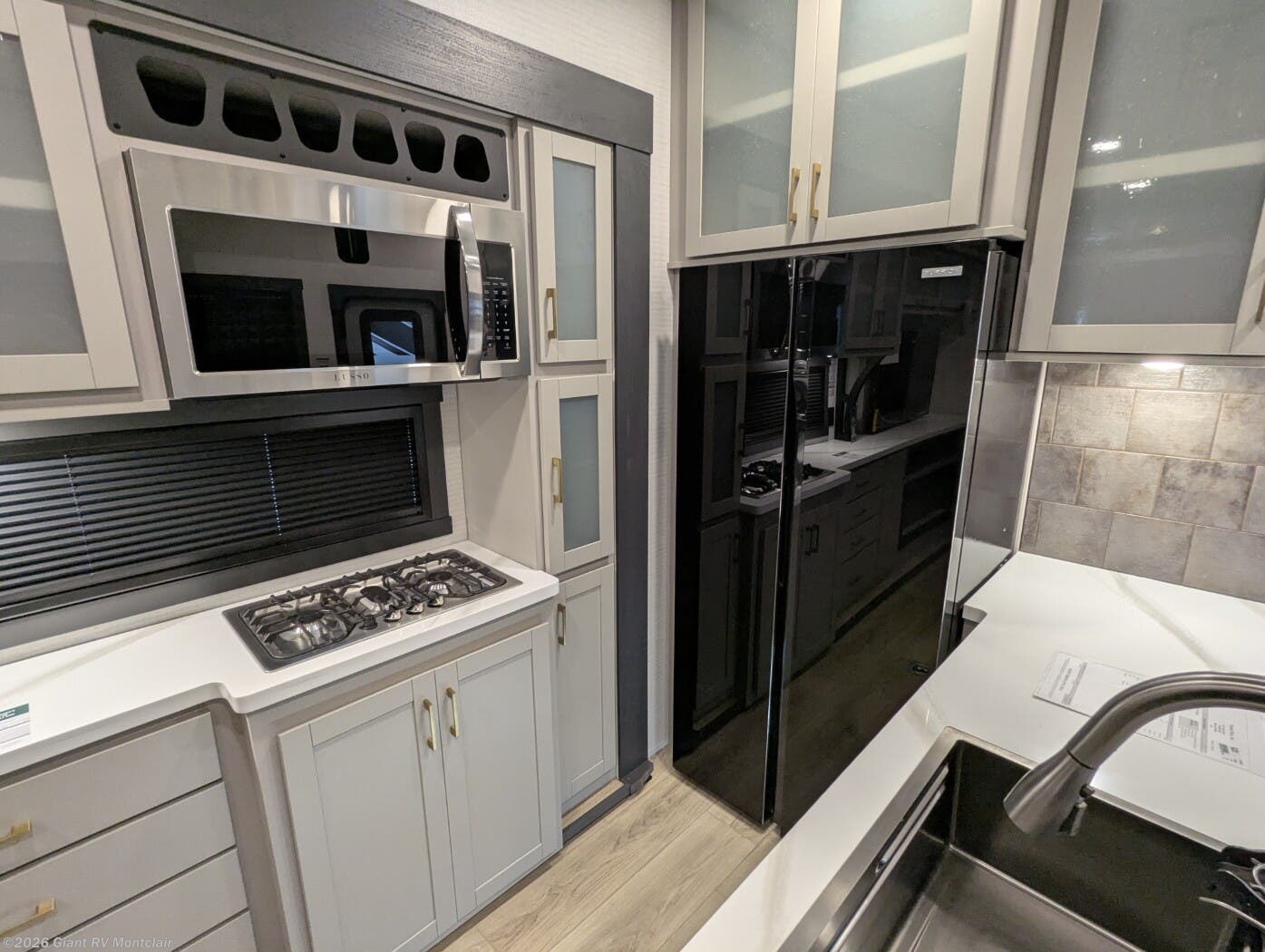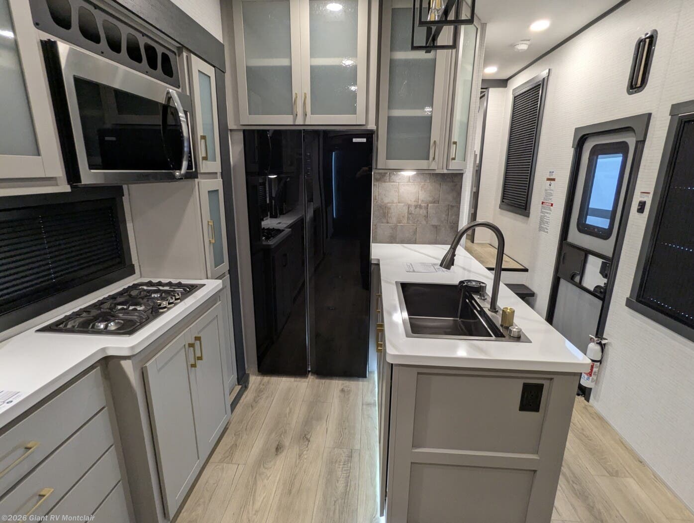 - Open Kitchen & Living Area offering solid-surface countertops, residential-style appliances, a roomy dinette or sofa setup, and flexible sleeping options in the garage zone when needed.