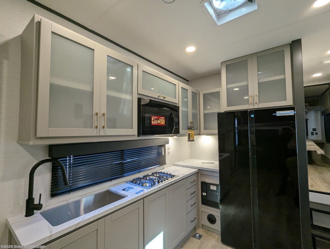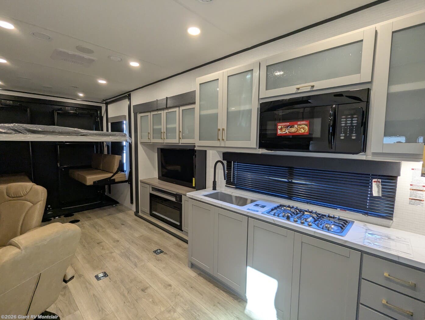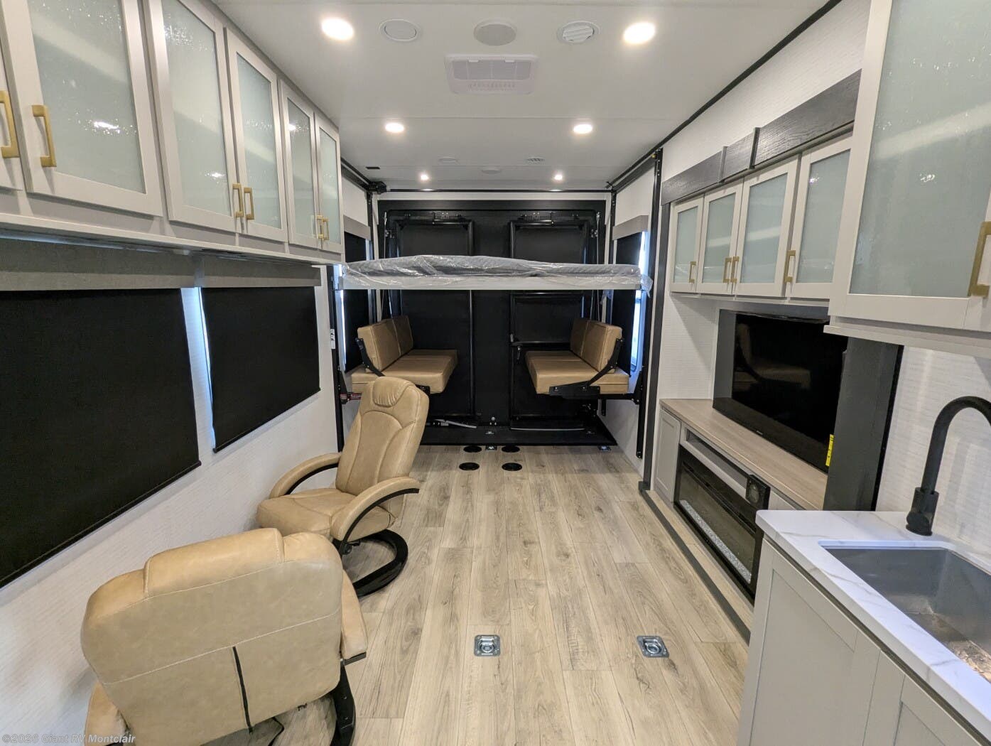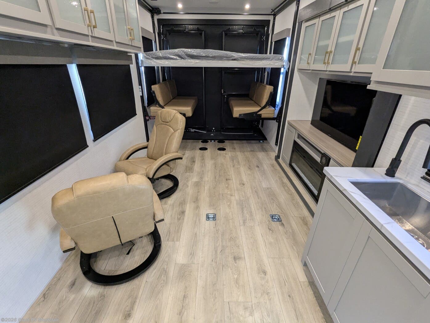 - Open Kitchen & Living Area with ample countertop space, full-size appliances, multiple seating options, and an entertainment center designed for relaxing after a day of riding.