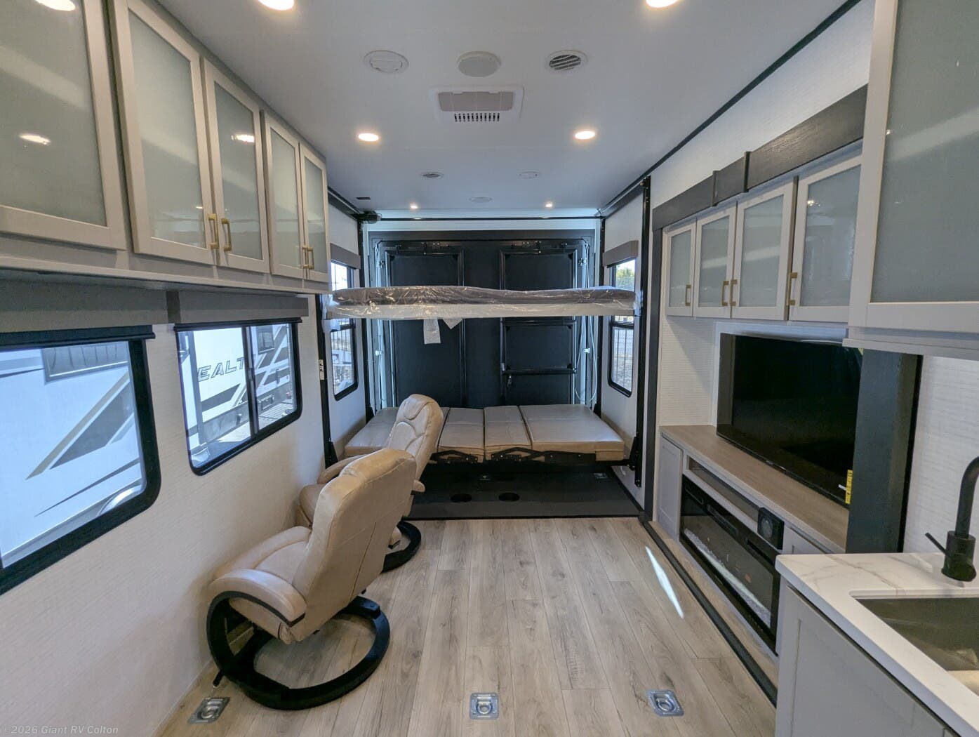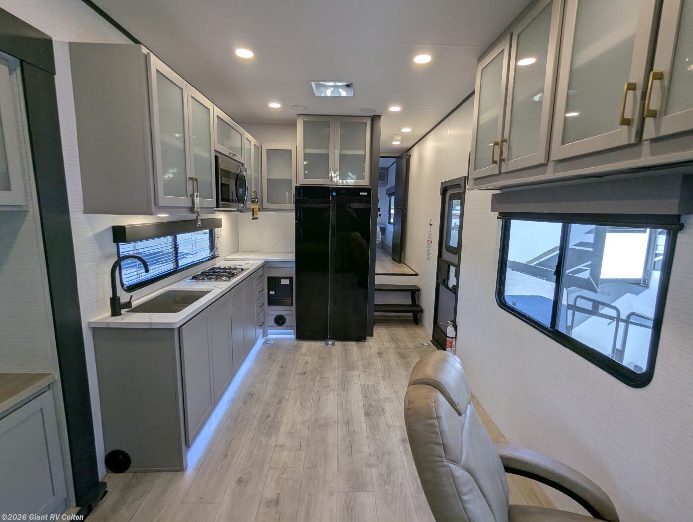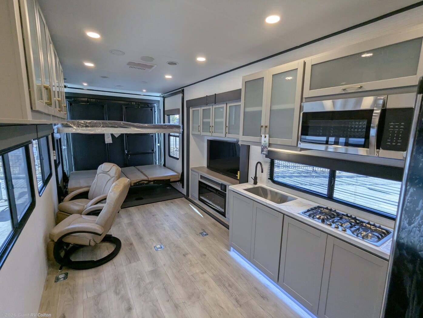 - Modern Kitchen: Equipped with a 15.6 cu. ft. 12V refrigerator, 3-burner cooktop, 1.5 cu. ft. convection microwave, and solid surface countertops.