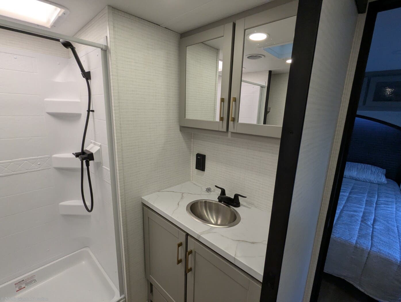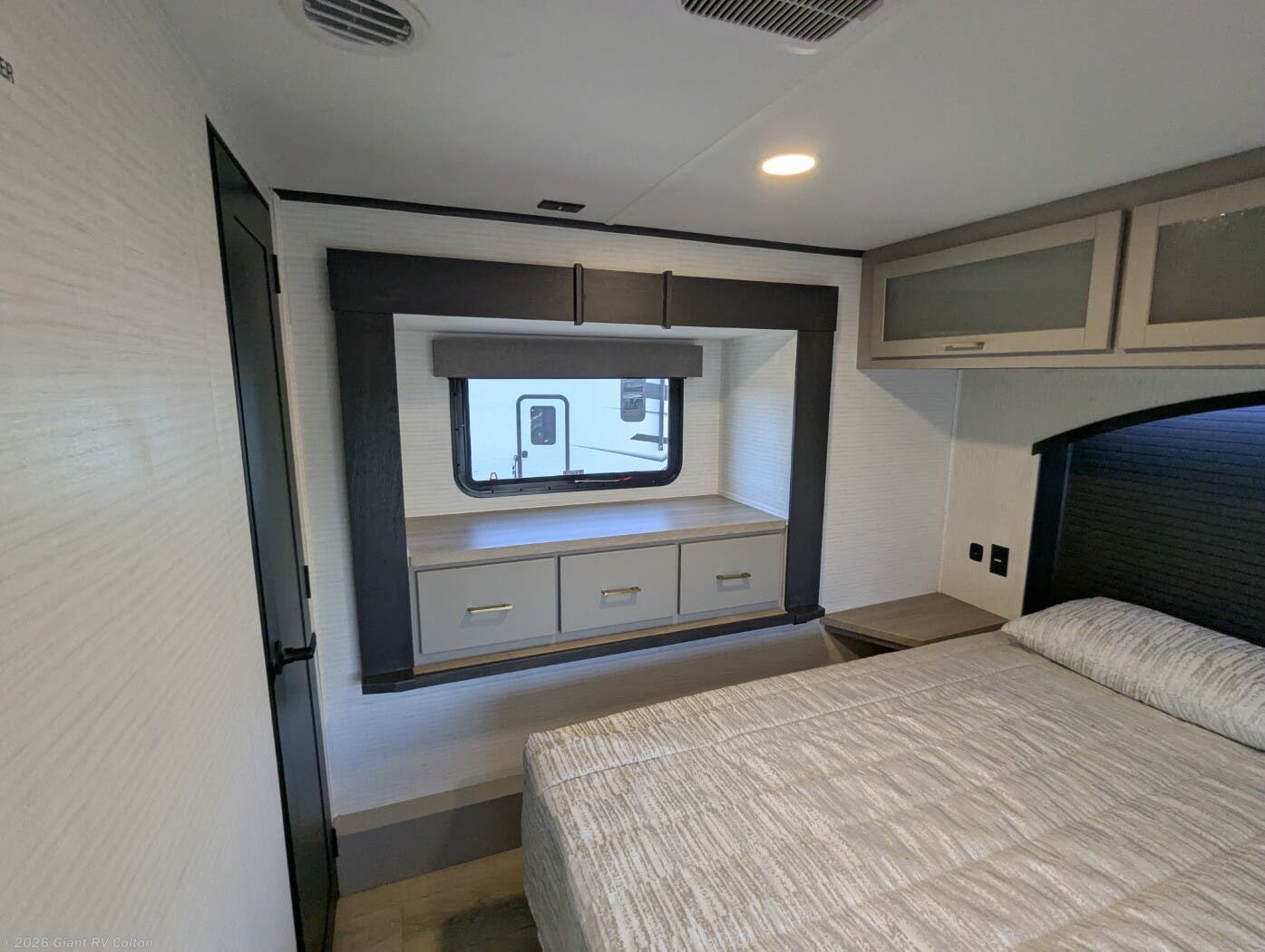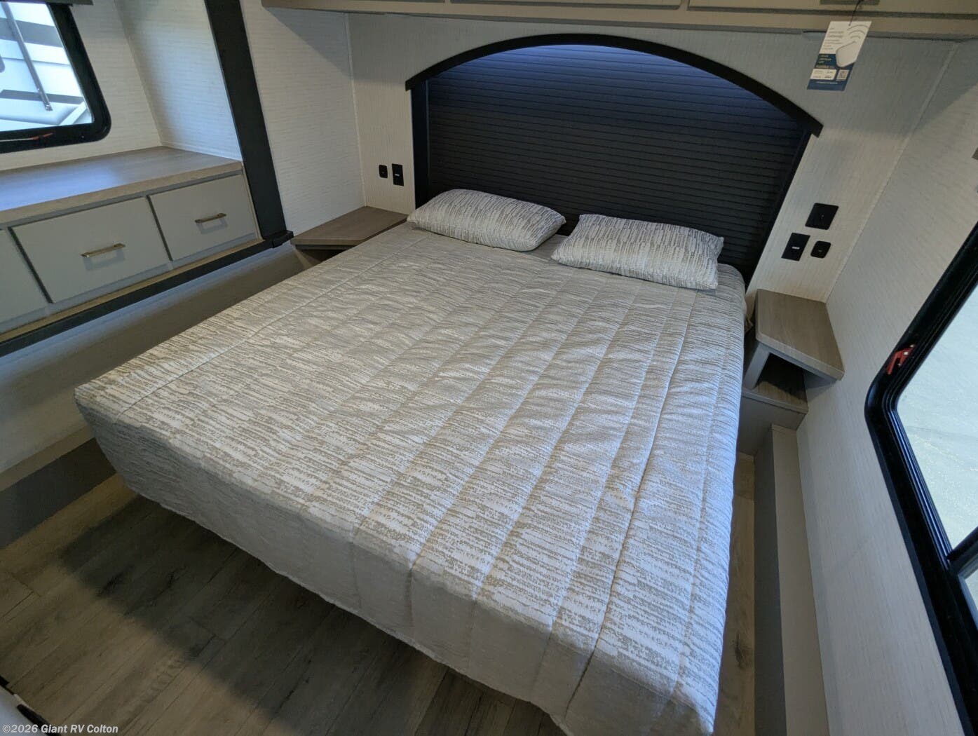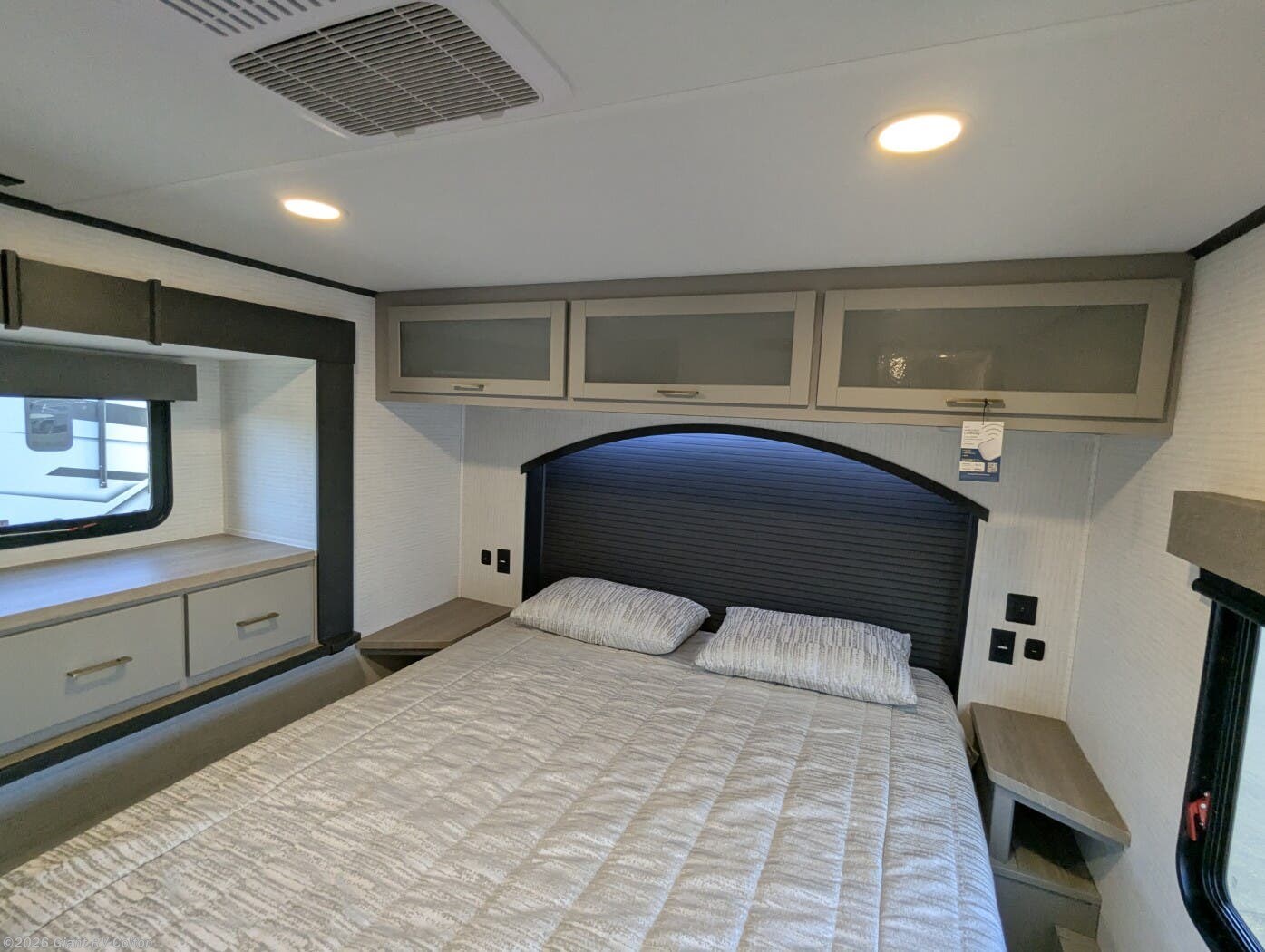 - Modern Kitchen: Equipped with a 15.6 cu. ft. 12V refrigerator, 3-burner cooktop, 1.5 cu. ft. convection microwave, and solid surface countertops.