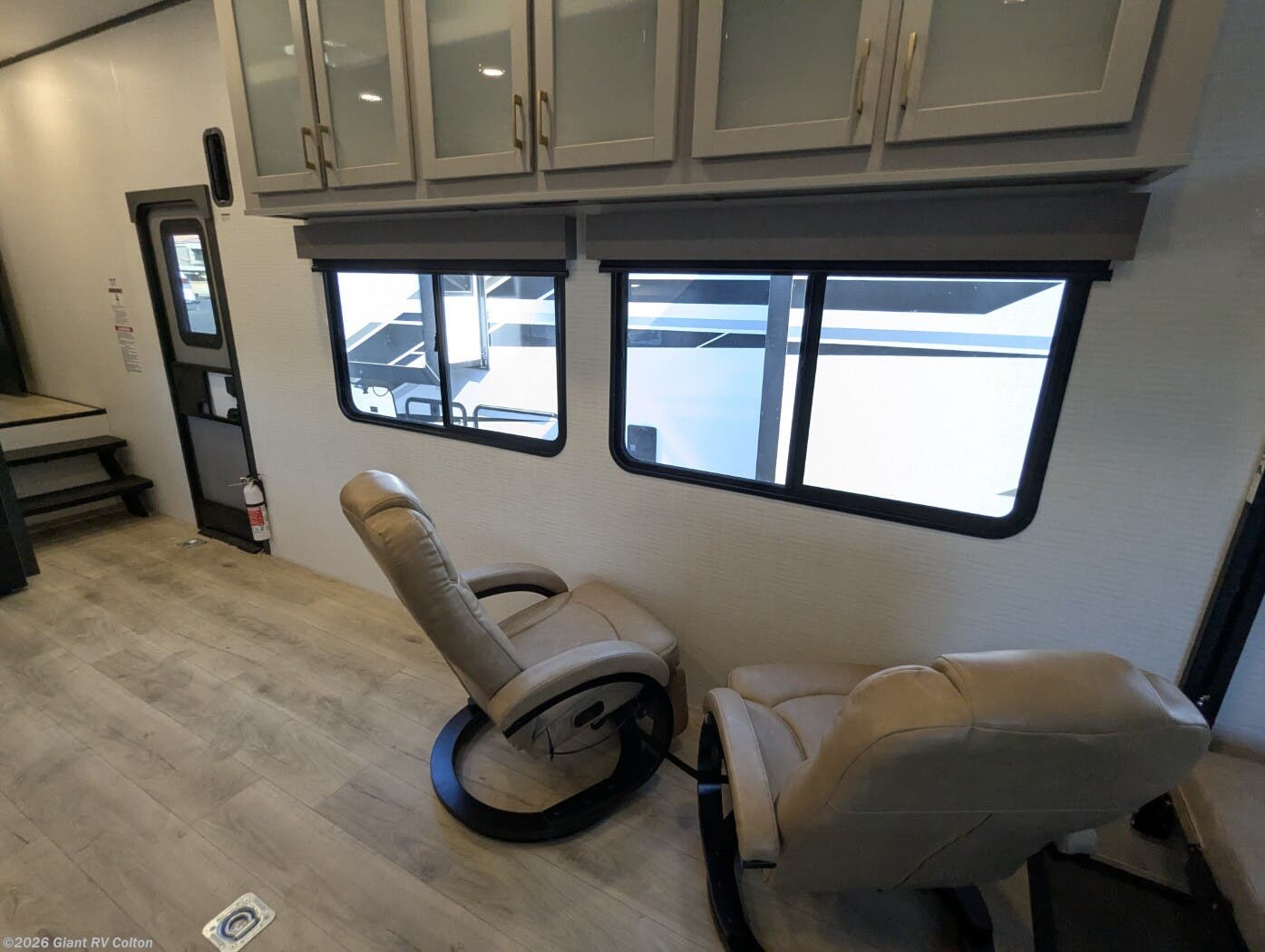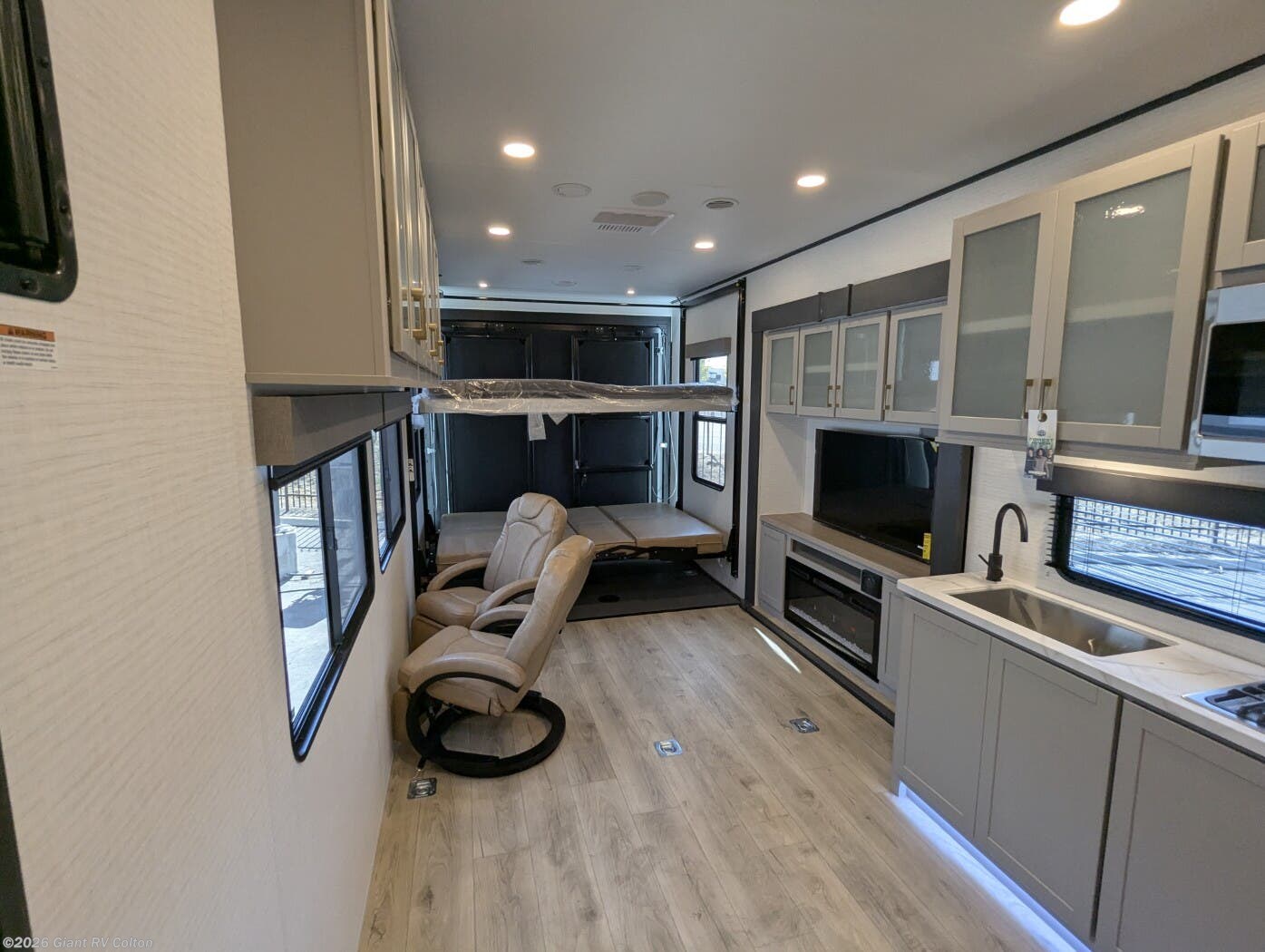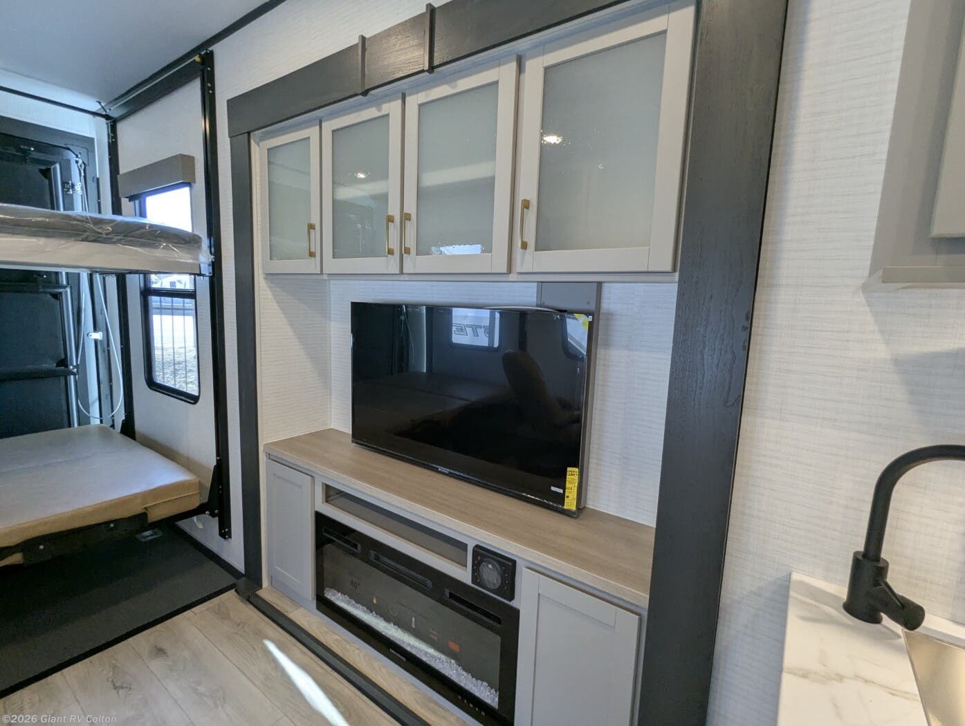 - Luxurious Living Area: Features an entertainment slide with a Smart TV, fireplace, and electric pass-thru dinette for a cozy, residential feel.