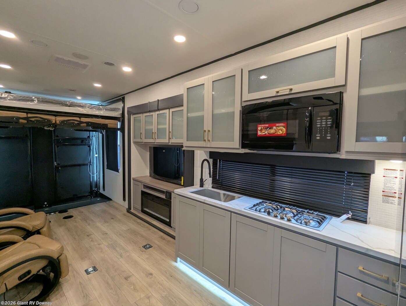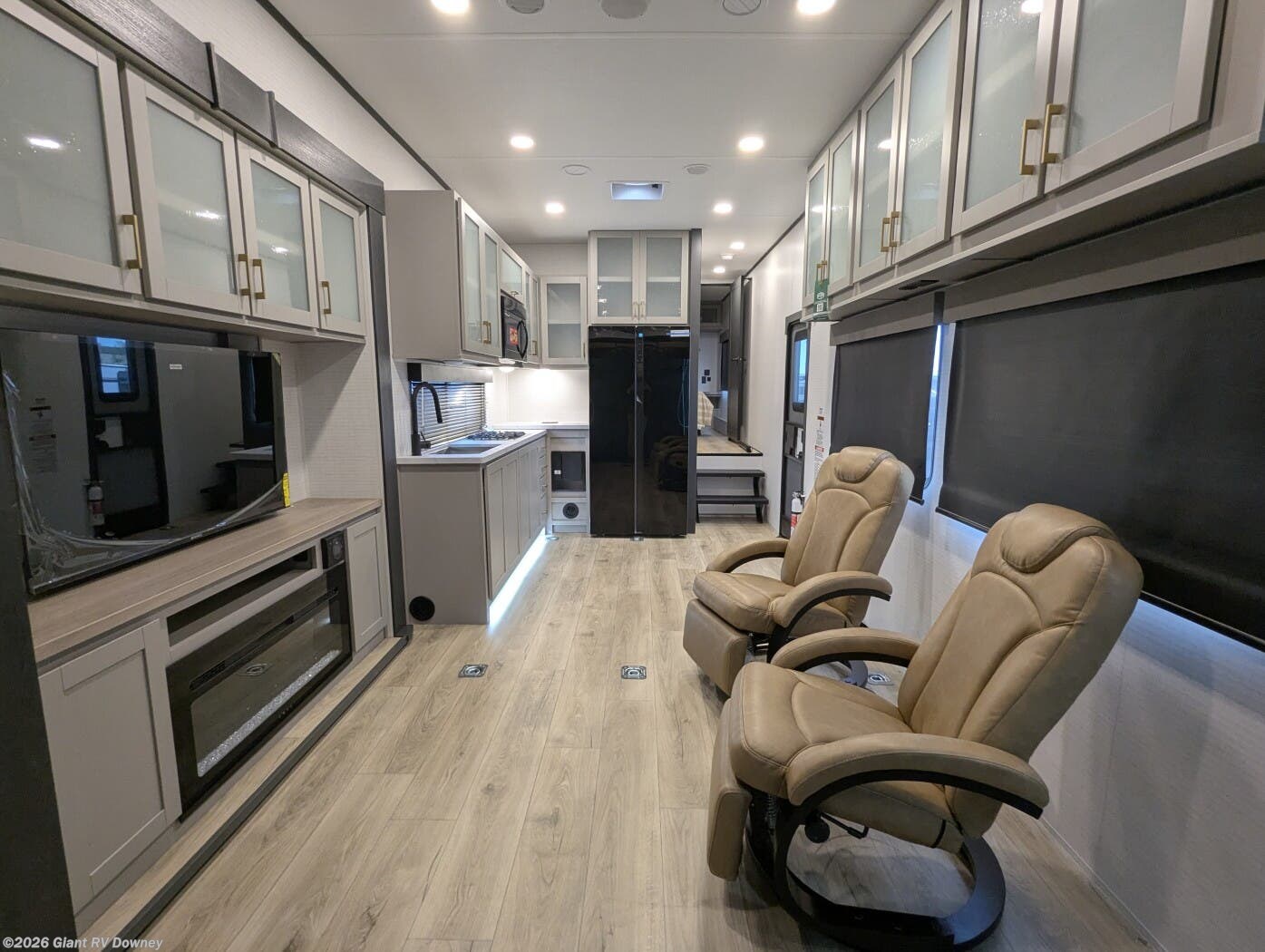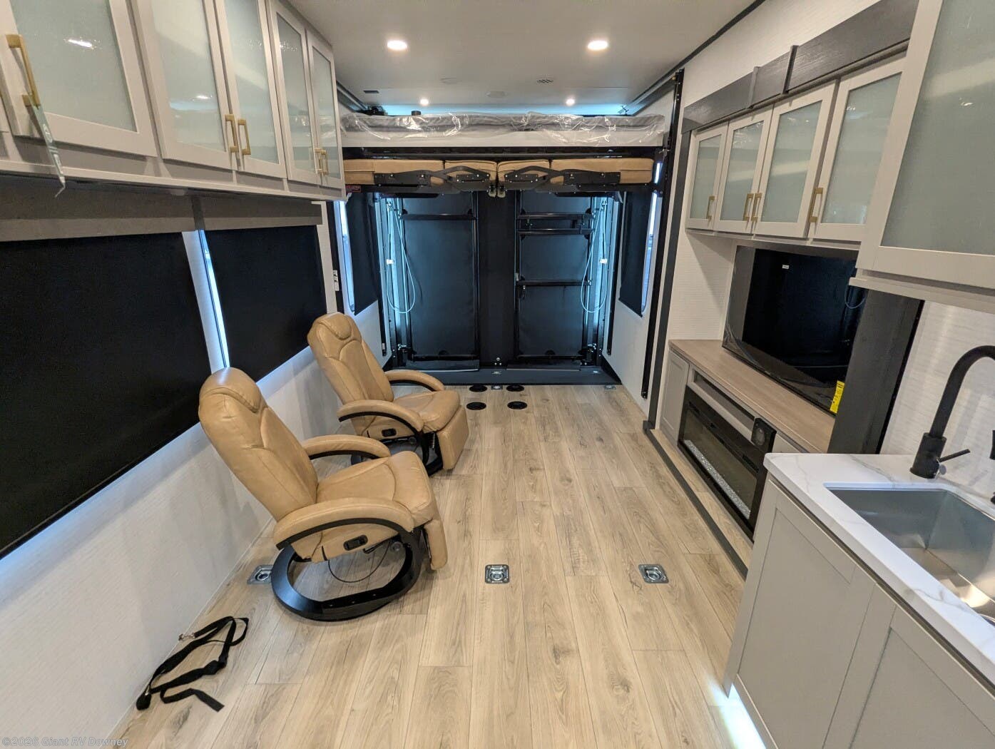 - Open Kitchen & Living Area with ample countertop space, full-size appliances, multiple seating options, and an entertainment center designed for relaxing after a day of riding.