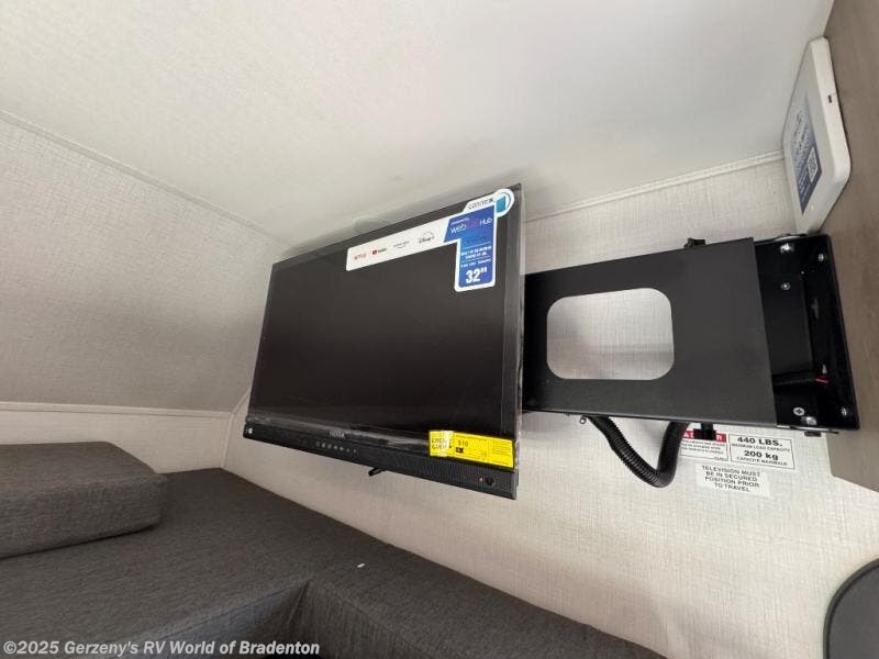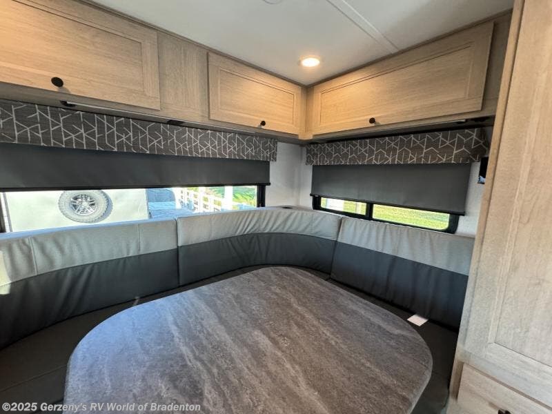 Upon entering this unit, you’re greeted by a spacious 60" x 80" cab-over bunk, providing plenty of comfortable sleeping space for family or guests. Near the entrance, a swing-arm 12V TV lets you enjoy your favorite shows and movies while on the road. Moving toward the center, you’ll find a pantry and a 10.7 cu. ft. refrigerator, perfect for storing both fresh groceries and dry goods. Adjacent to it is the well-designed wet bath, equipped with an oxygen-infused showerhead and flexible extension for a refreshing experience, complemented by a shower skylight and electric roof fan for added light and ventilation. Across the way, the kitchen comes fully equipped with a recessed two-burner range and flush glass cover, a convection microwave/air fryer, and a flip-up countertop that expands your workspace, making meal prep easy and efficient. At the rear, the inviting U-shaped dinette offers a cozy spot to relax, dine, or gather with friends, and at night, it effortlessly converts into an additional sleeping area so you can rest in complete comfort.