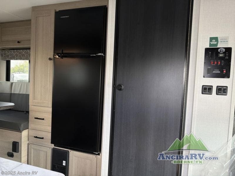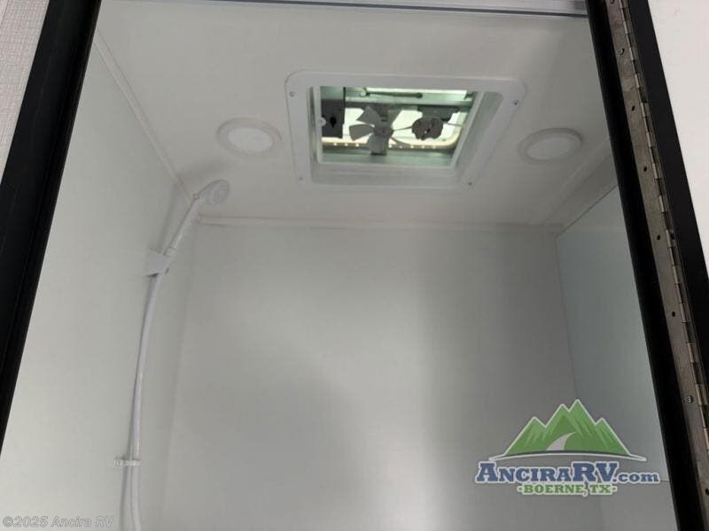 Upon entering this unit, you’re greeted by a spacious 60" x 80" cab-over bunk, providing plenty of comfortable sleeping space for family or guests. Near the entrance, a swing-arm 12V TV lets you enjoy your favorite shows and movies while on the road. Moving toward the center, you’ll find a pantry and a 10.7 cu. ft. refrigerator, perfect for storing both fresh groceries and dry goods. Adjacent to it is the well-designed wet bath, equipped with an oxygen-infused showerhead and flexible extension for a refreshing experience, complemented by a shower skylight and electric roof fan for added light and ventilation. Across the way, the kitchen comes fully equipped with a recessed two-burner range and flush glass cover, a convection microwave/air fryer, and a flip-up countertop that expands your workspace, making meal prep easy and efficient. At the rear, the inviting U-shaped dinette offers a cozy spot to relax, dine, or gather with friends, and at night, it effortlessly converts into an additional sleeping area so you can rest in complete comfort.