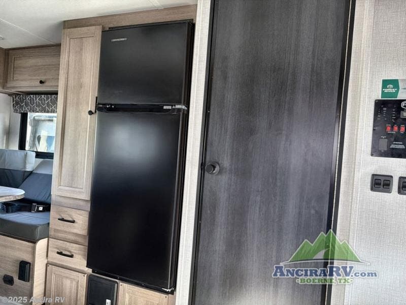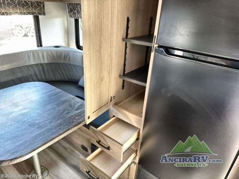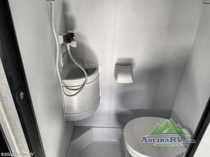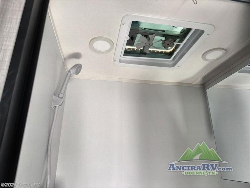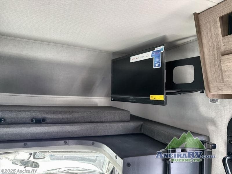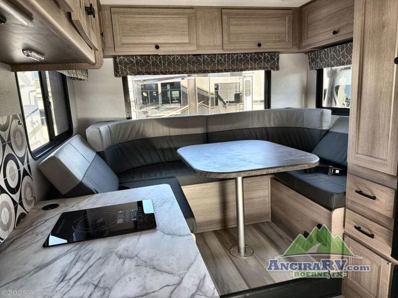 Upon entering this unit, you’re greeted by a spacious 60" x 80" cab-over bunk, providing plenty of comfortable sleeping space for family or guests. Near the entrance, a swing-arm 12V TV lets you enjoy your favorite shows and movies while on the road. Moving toward the center, you’ll find a pantry and a 10.7 cu. ft. refrigerator, perfect for storing both fresh groceries and dry goods. Adjacent to it is the well-designed wet bath, equipped with an oxygen-infused showerhead and flexible extension for a refreshing experience, complemented by a shower skylight and electric roof fan for added light and ventilation. Across the way, the kitchen comes fully equipped with a recessed two-burner range and flush glass cover, a convection microwave/air fryer, and a flip-up countertop that expands your workspace, making meal prep easy and efficient. At the rear, the inviting U-shaped dinette offers a cozy spot to relax, dine, or gather with friends, and at night, it effortlessly converts into an additional sleeping area so you can rest in complete comfort.