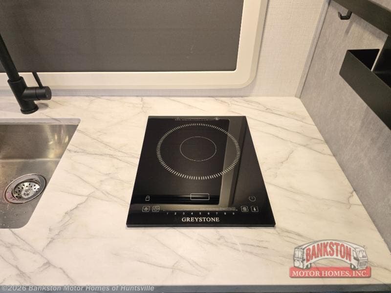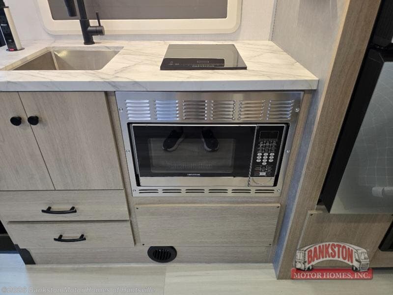 Everything you need is found in this cozy motorhome for five to six people. The swivel captain's seats can become a part of the living area once you park, and your guests can gather around the U-shaped dinette slide for game night. Your meals can be prepared each day on the induction cooktop with a convection microwave, and the flip-up counter will provide more prep space. There is also a 10.7 cu. ft. 12V refrigerator for food storage. The bedroom features a queen bed slide, 12V TV, plus a wardrobe to keep your clothes organized. A 60" x 80" cab-over bunk provides more sleeping space, or you can choose the optional Trekker cap with a built-in entertainment center!