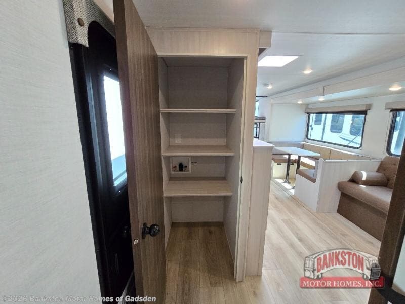 Head to your favorite camping spot with your favorite people in this spacious, dual entry travel trailer! The large slide out houses the U-shaped dinette and sofa where you can relax in the evenings and even let guests sleep over who haven't claimed the double-size bunks. A full bath with its own exterior entry door is convenient for all, and the full kitchen lets you whip up your best meals in the microwave with an air fryer. There is also a walk-in pantry with washer and dryer prep, which gives you the option to add those appliances. When it's time to call it a night, the front private bedroom with a queen bed will provide you with your own space to retreat to, and there are dual bedside wardrobes to keep your clothes organized.