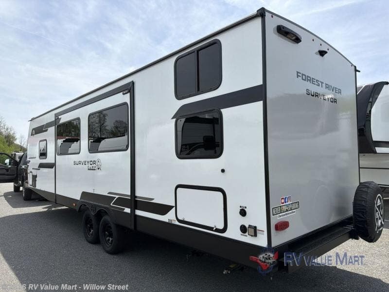 Value and versatility go hand-in-hand with the Surveyor Camp Series travel trailers by Forest River. The solid construction includes a 2" aluminum framed floor with block foam insulation and a sealed underbelly with forced heat and radiant foil insulation. A 100-watt roof mounted solar panel will provide some off-grid power, and the power tongue jack will let you easily hitch up and go whenever you're ready. Additional stand-out features include Surf(X) seamless countertops throughout, two A/C units, an electric awning with LED light strip, black glass friction hinge entry door(s), and so much more!