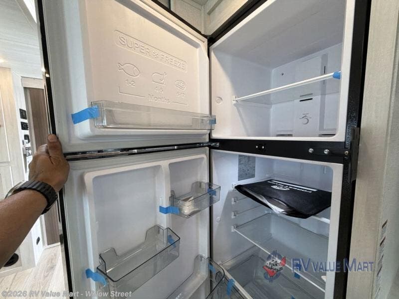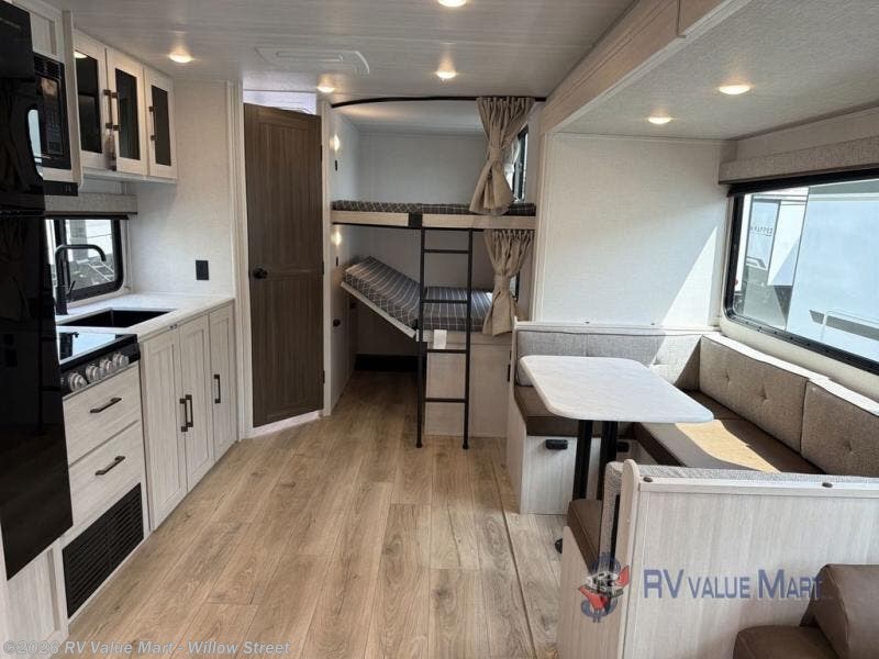 Head to your favorite camping spot with your favorite people in this spacious, dual entry travel trailer! The large slide out houses the U-shaped dinette and sofa where you can relax in the evenings and even let guests sleep over who haven't claimed the double-size bunks. A full bath with its own exterior entry door is convenient for all, and the full kitchen lets you whip up your best meals in the microwave with an air fryer. There is also a walk-in pantry with washer and dryer prep, which gives you the option to add those appliances. When it's time to call it a night, the front private bedroom with a queen bed will provide you with your own space to retreat to, and there are dual bedside wardrobes to keep your clothes organized.