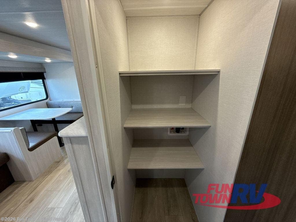 Head to your favorite camping spot with your favorite people in this spacious, dual entry travel trailer! The large slide out houses the booth dinette and sofa where you can relax in the evenings and even let guests sleep over who haven't claimed the quad bunks in the rear bunkhouse. A walk-thru bath is convenient for all, and the full kitchen lets you whip up your best meals in the microwave with an air fryer. And a walk-in pantry with washer and dryer prep makes it easier to go full-time if you choose! When it's time to call it a night, the front master bedroom with a queen bed will provide you with your own space to retreat to, and there are dual bedside wardrobes to keep your clothes organized.
