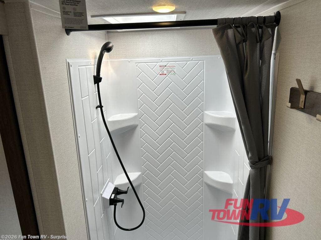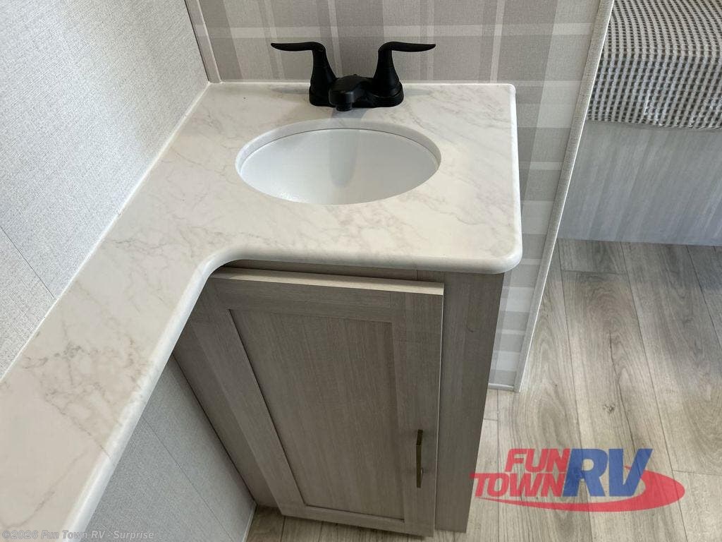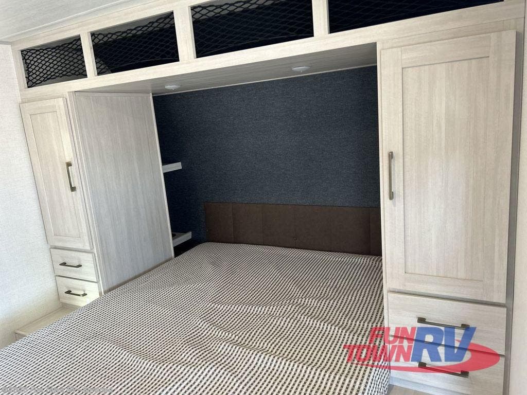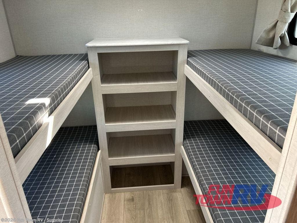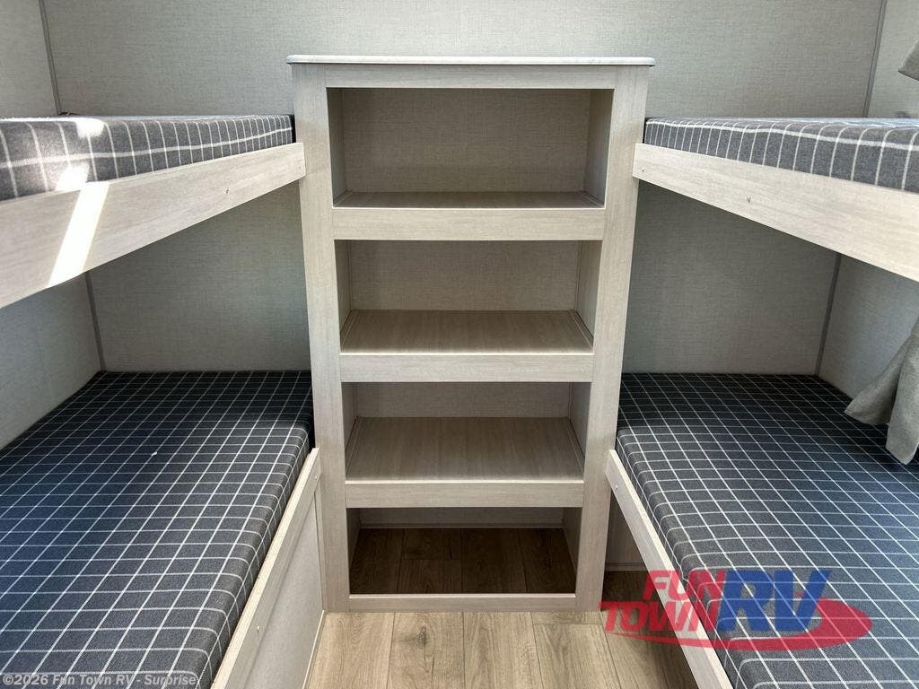 Head to your favorite camping spot with your favorite people in this spacious, dual entry travel trailer! The large slide out houses the booth dinette and sofa where you can relax in the evenings and even let guests sleep over who haven't claimed the quad bunks in the rear bunkhouse. A walk-thru bath is convenient for all, and the full kitchen lets you whip up your best meals in the microwave with an air fryer. And a walk-in pantry with washer and dryer prep makes it easier to go full-time if you choose! When it's time to call it a night, the front master bedroom with a queen bed will provide you with your own space to retreat to, and there are dual bedside wardrobes to keep your clothes organized.