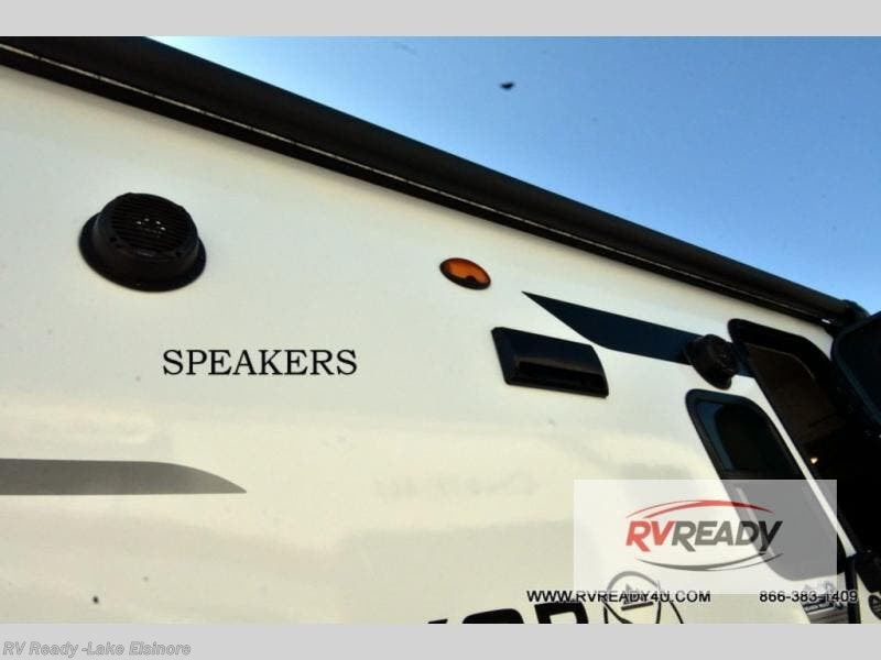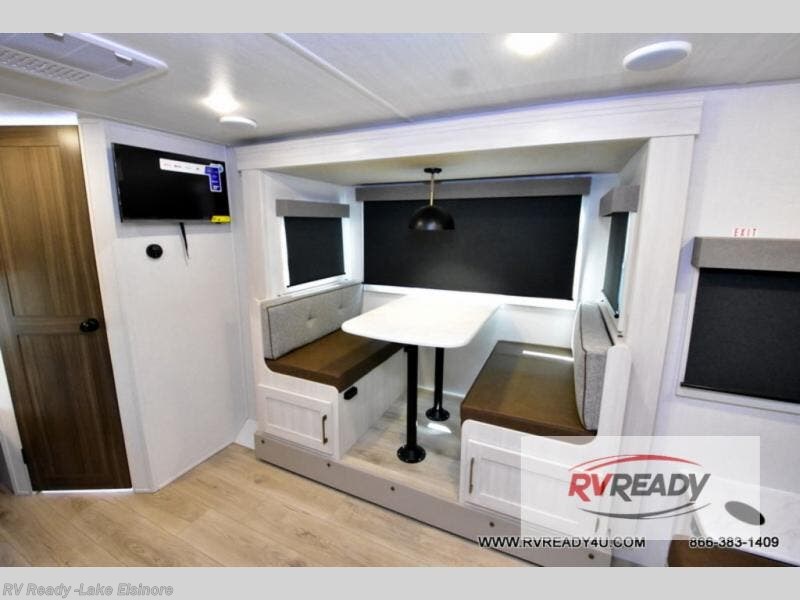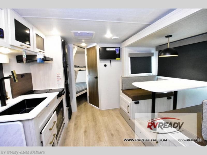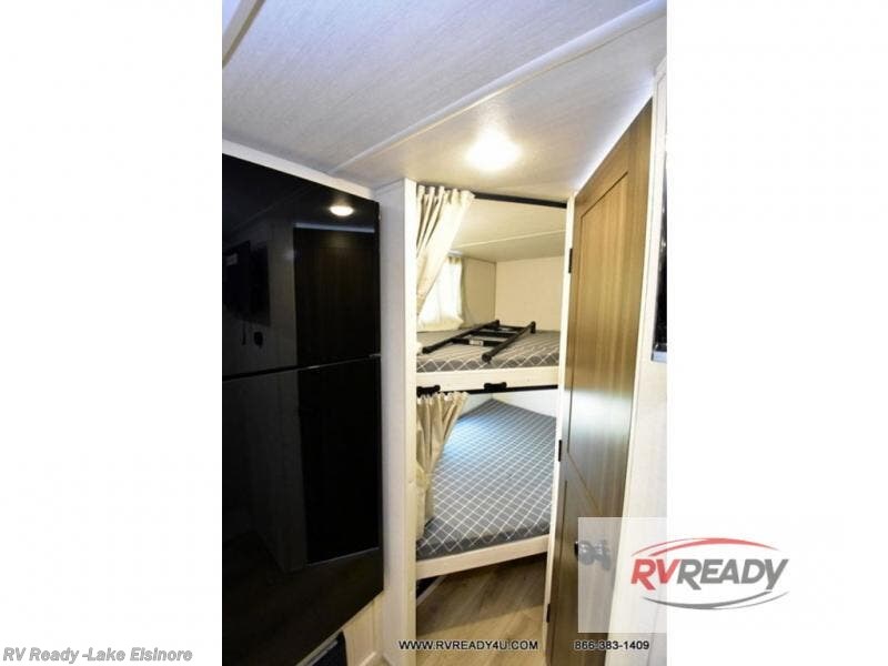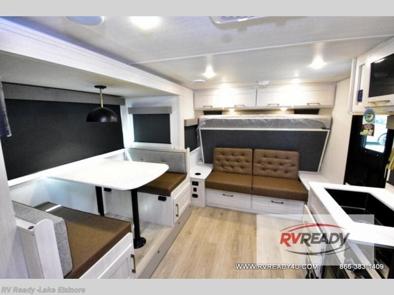 Experiencing the camping lifestyle just got easier with this travel trailer in tow! The outdoor kitchen includes griddle and a shelf, plus there is a two burner cooktop inside if the weather isn't cooperating. There is a dinette slide where you can play a game of cards at, and the HD TV will allow you to keep up on your favorite shows. The kids or your guests can make themselves comfortable on the oversized bunks with a ladder, and the spacious full bath is close by for easy nighttime use. This model also includes a front queen-size Murphy bed with two end tables to set your books or phone on, plus there is overhead storage for your valuables.