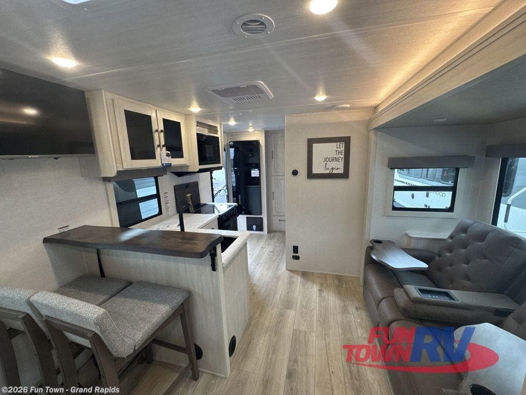 You're going to love every minute spent in this 25' travel trailer! The counter with stools will be the perfect place to enjoy your morning coffee at, plus there is a dinette slide for more seating space. You will get a great night's rest on the queen bed in the front bedroom, and the two wardrobes allow you to keep your clothes tidy. Further customize this trailer by adding the theater seating option or tri-fold sofa option in place of the dinette, and you'll enjoy the standard HD TV for late-night movies!
