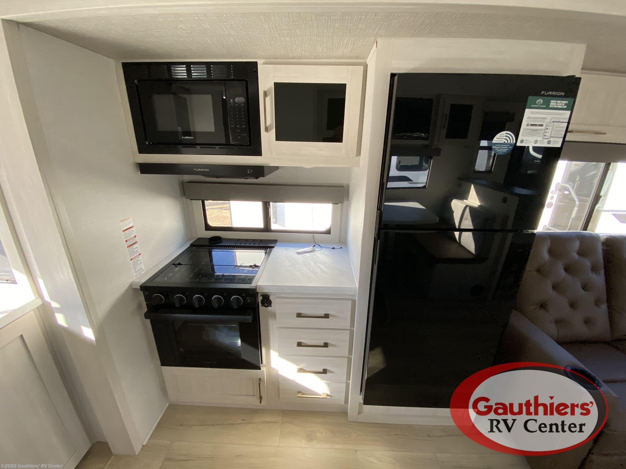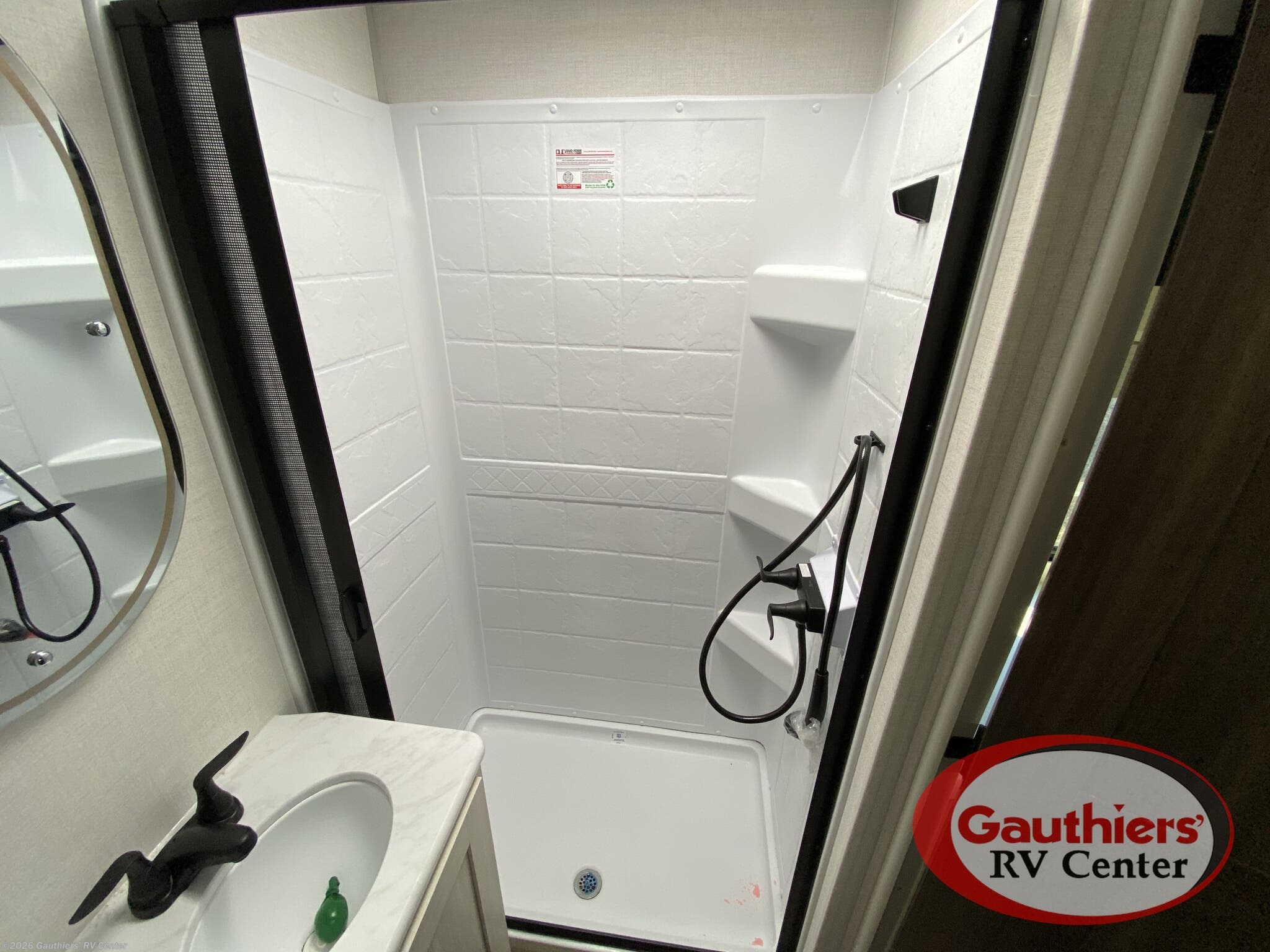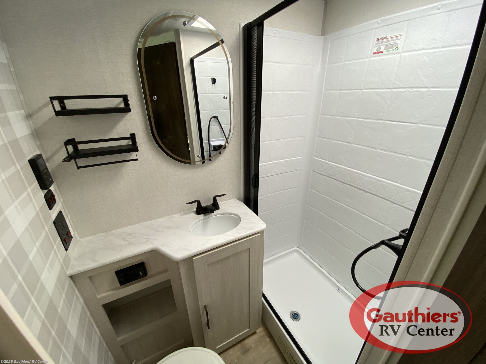 This travel trailer seats and fuels comfort with modern conveniences that travelers expect on the road. The interior includes a functional dinette, kitchen sink, refrigerator, water heater, and a central vacuum for easy cleanup. It also features a full bathroom with a shower, toilet, and vanity, making it practical for extended trips without sacrificing style or comfort.