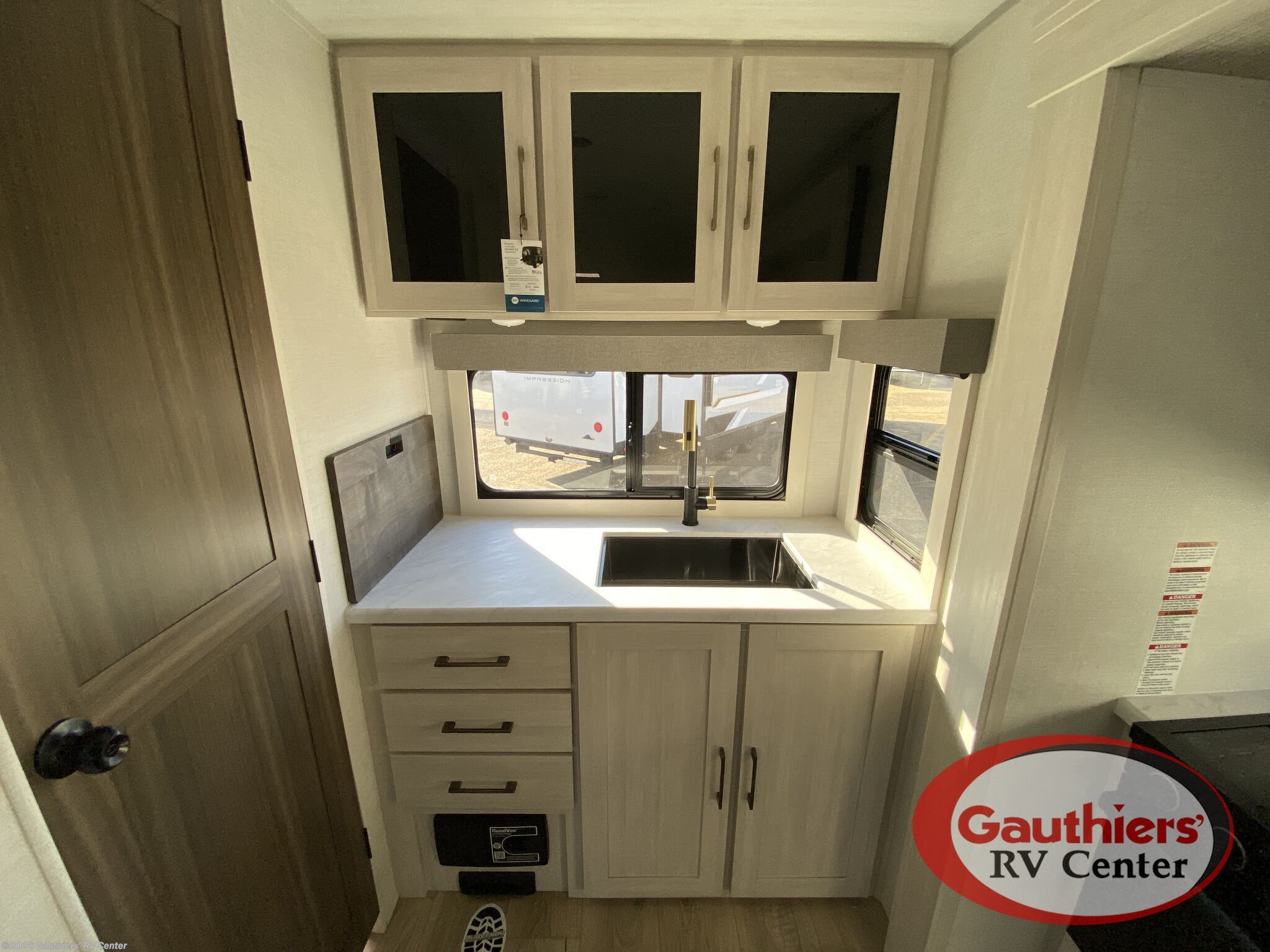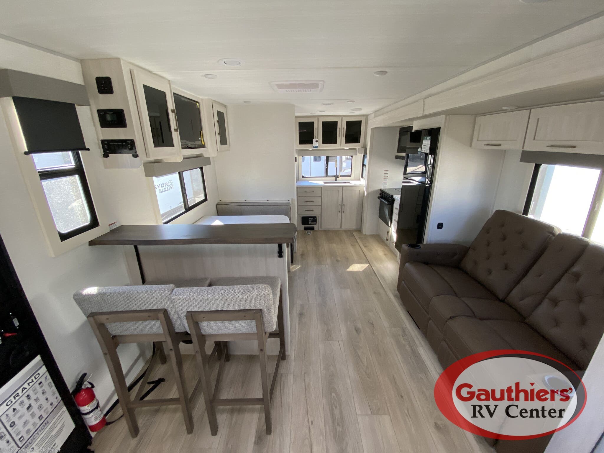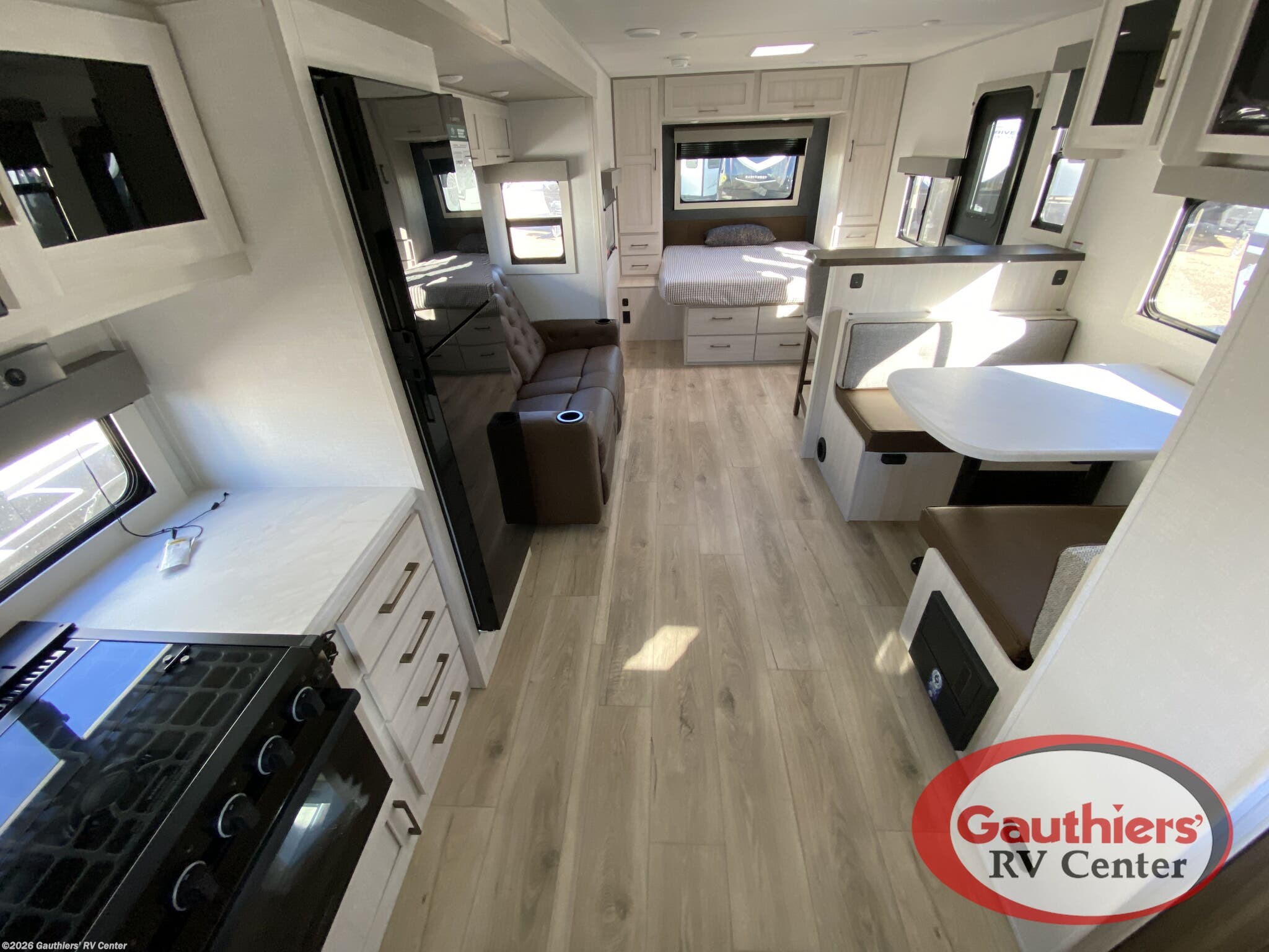 This travel trailer seats and fuels comfort with modern conveniences that travelers expect on the road. The interior includes a functional dinette, kitchen sink, refrigerator, water heater, and a central vacuum for easy cleanup. It also features a full bathroom with a shower, toilet, and vanity, making it practical for extended trips without sacrificing style or comfort.