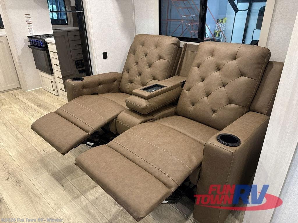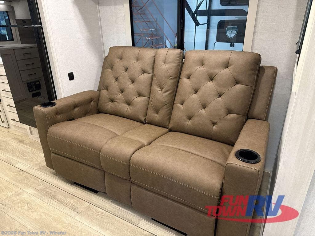 You'll love camping and spending time with loved ones in this spacious travel trailer. The 18' power awning with LED lights can be set up once you arrive at the campground, and you can unload camp gear from the pass-through storage. Head inside to make lunch on the residential range top or in the microwave oven. There is a booth dinette and tri-fold sofa for seating space, plus an additional counter with bar stools beside the dinette. A full bath onboard lets you clean up each day, and the front queen bed is sure to bring a great night's rest. There are also dual wardrobes to keep your space tidy and overhead storage for even more belongings.