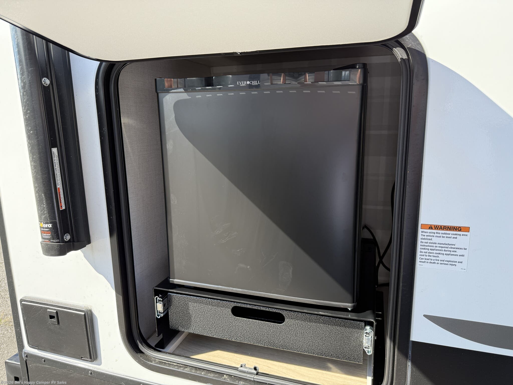 Awning, Black Tank Flush, Enclosed Underbelly, Exterior Speakers, External Shower, Fiberglass Sidewalls, Front Overhead Storage, Griddle, Heated Underbelly, Hitch, Outside Kitchen, Pass Thru Storage, Power Awning, Power Hitch Jack, Roof Vent, Screen Door, Skylight, Slam Latch Baggage Doors, Slideout, Spare Tire Kit -