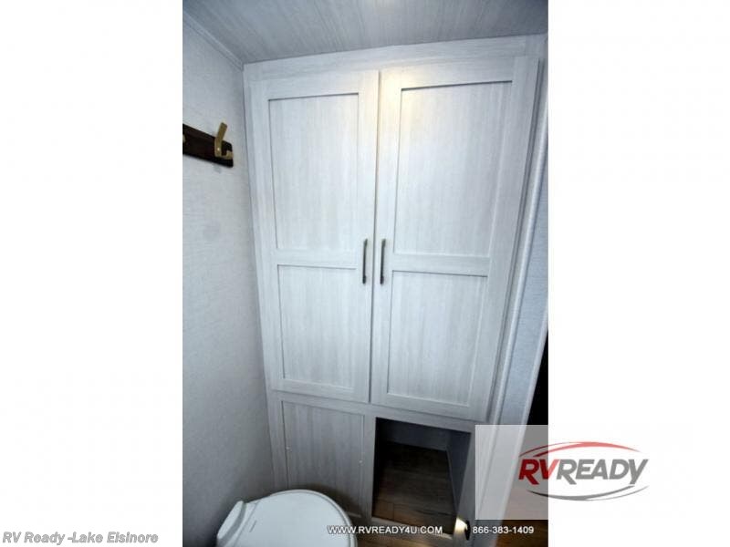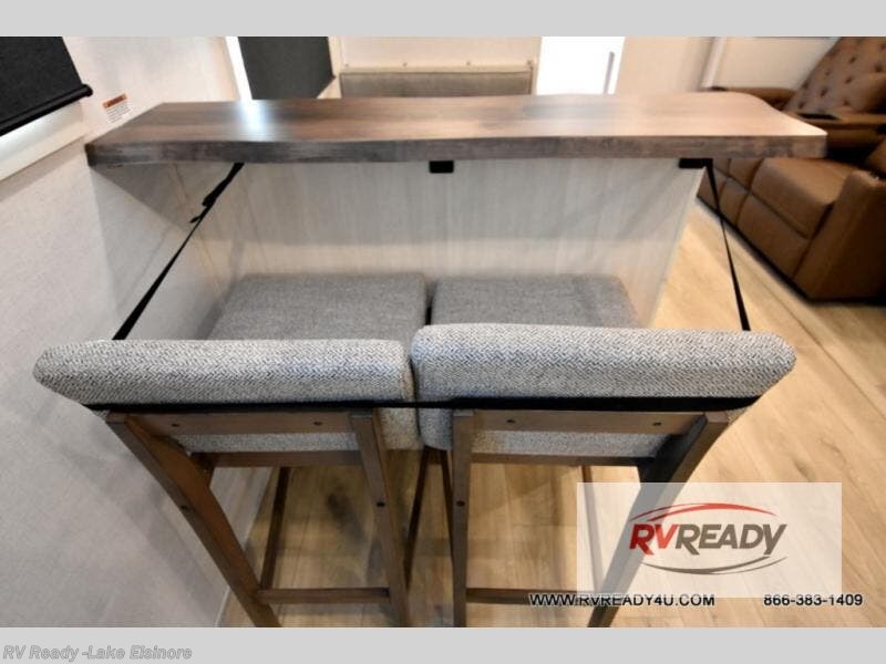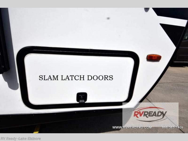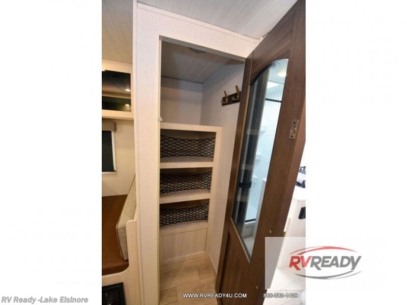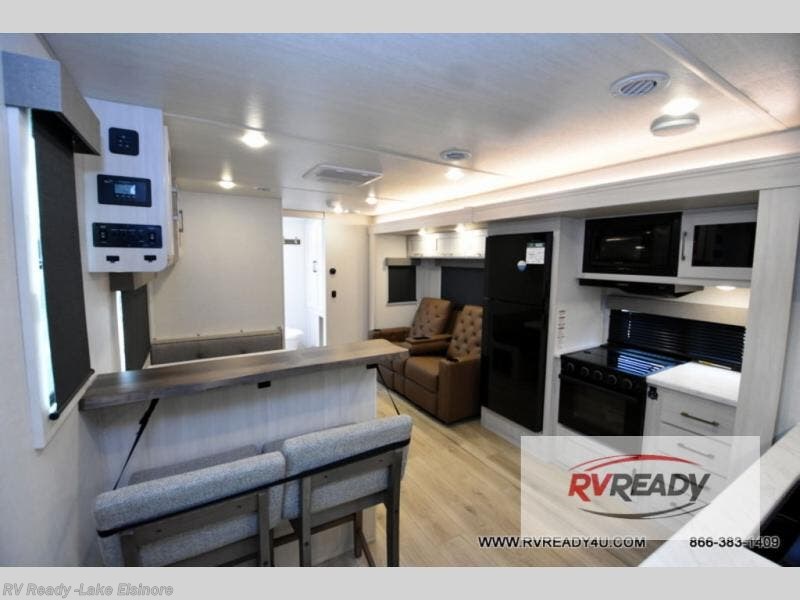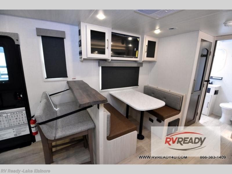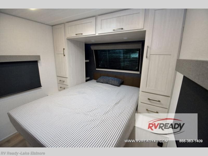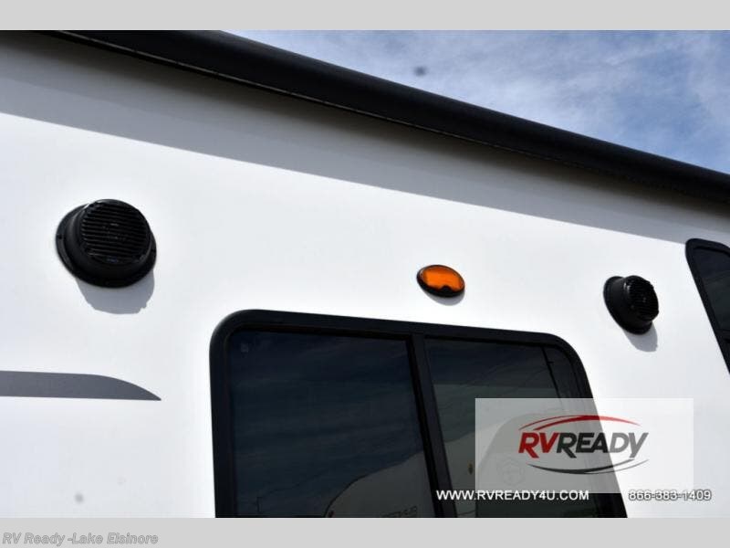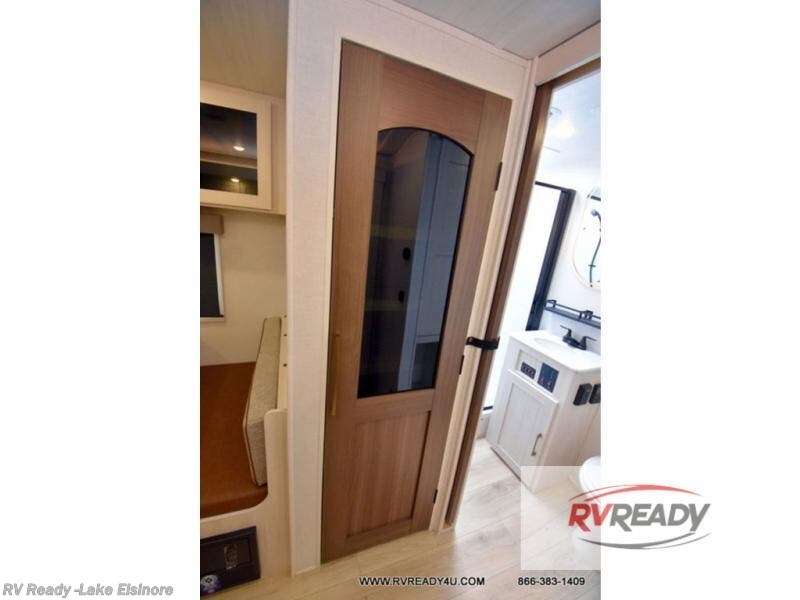 Fun at the campground begins in this spacious travel trailer for five to six! You will enjoy having your own front private bedroom with a queen bed, while your guests sleep on the EZ-out sofa and booth dinette in the main living area. Breakfast can be made in the full kitchen on the residential range or outside on the exterior kitchen. There is ample storage space throughout this model, including dual bedroom wardrobes, overhead cabinets, a bath linen closet, and a walk-in pantry.