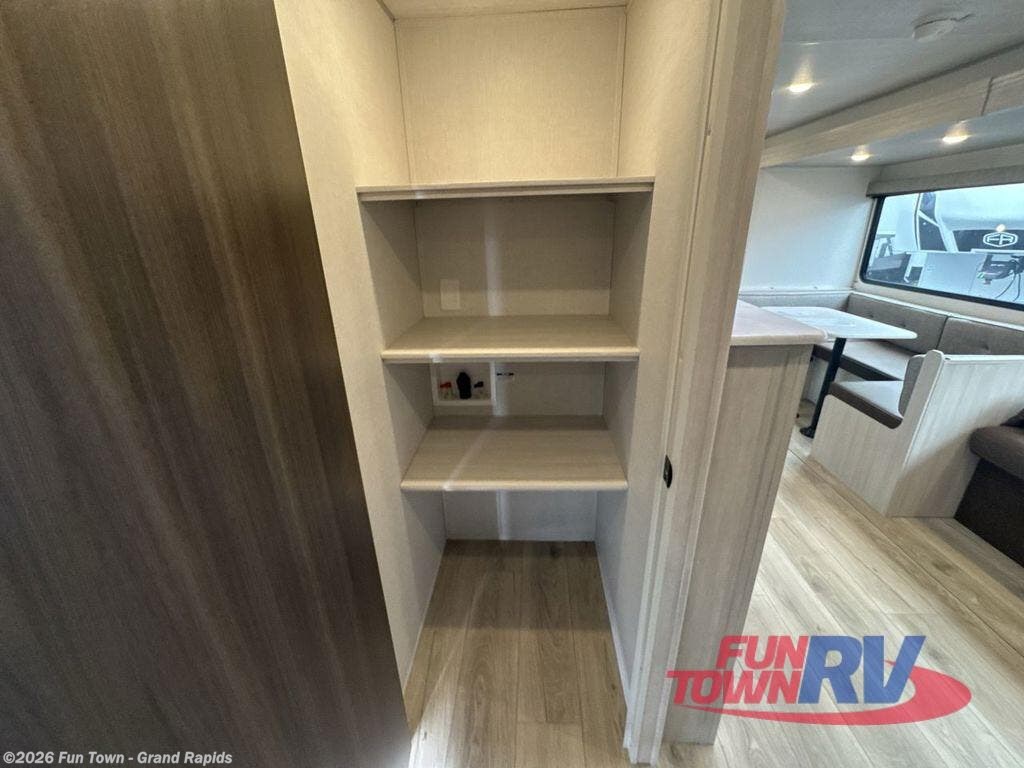 Head to your favorite camping spot with your favorite people in this spacious, dual entry travel trailer! The large slide out houses the U-shaped dinette and sofa where you can relax in the evenings and even let guests sleep over who haven't claimed the double-size bunks. A full bath with its own exterior entry door is convenient for all, and the full kitchen lets you whip up your best meals in the microwave with an air fryer. There is also a walk-in pantry with washer and dryer prep, which gives you the option to add those appliances. When it's time to call it a night, the front private bedroom with a queen bed will provide you with your own space to retreat to, and there are dual bedside wardrobes to keep your clothes organized.