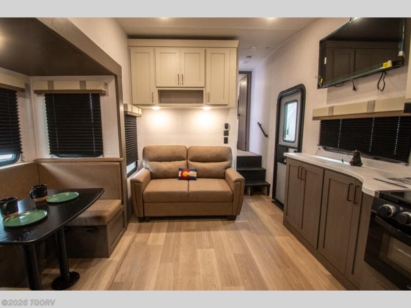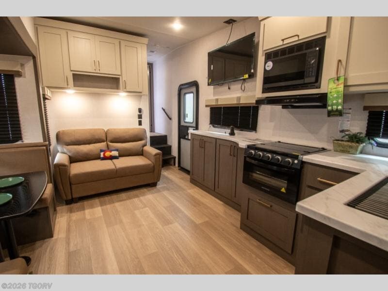 Built with durable construction and finished in artesian maple décor, this fifth wheel focuses on function and everyday usability. Strong tank capacities and a 20' awning support both extended stays and weekend trips.