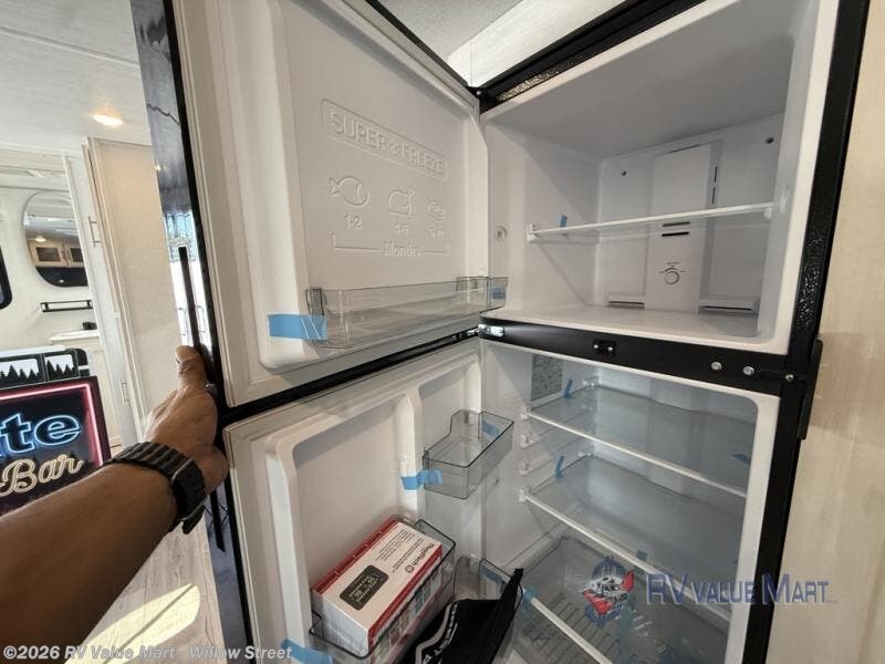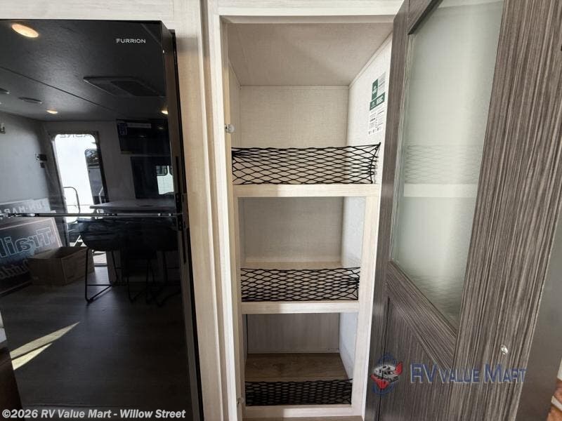 The rear bathroom with a linen closet is for personal care and storage of linens, a front bedroom with a king bed and two wardrobes, creates a serene retreat with ample storage for clothing and personal items, perfect for restful nights. The theater seating provides immersive comfort for relaxation and entertainment, ideal for enjoying movies or unwinding after a day of exploration. Overhead cabinets deliver additional storage for travel essentials and keepsakes. The kitchen area boasts a fridge, a pantry, an air fryer/microwave that combines versatility for quick and healthy meal preparation, a countertop extension, and a flip-up window that enhances ventilation and brings in natural light for a bright kitchen ambiance. You can also enjoy the outdoor living delights by cooking in the incredible outlook kitchen un ther the protection of the power awning.