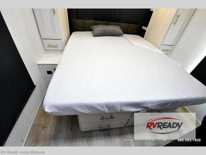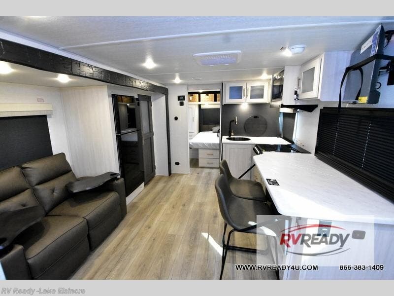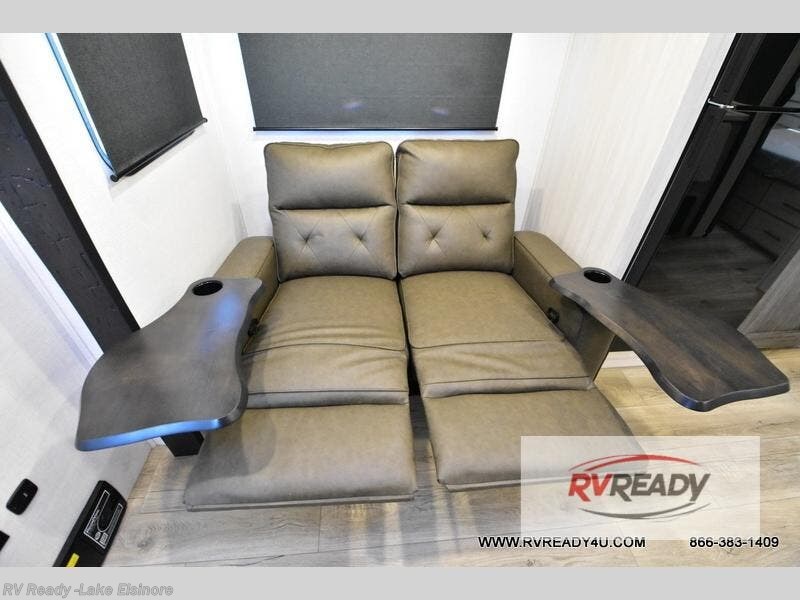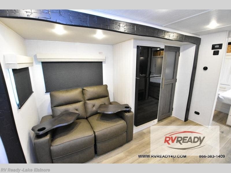 The rear bathroom with a linen closet is for personal care and storage of linens, a front bedroom with a king bed and two wardrobes, creates a serene retreat with ample storage for clothing and personal items, perfect for restful nights. The theater seating provides immersive comfort for relaxation and entertainment, ideal for enjoying movies or unwinding after a day of exploration. Overhead cabinets deliver additional storage for travel essentials and keepsakes. The kitchen area boasts a fridge, a pantry, an air fryer/microwave that combines versatility for quick and healthy meal preparation, a countertop extension, and a flip-up window that enhances ventilation and brings in natural light for a bright kitchen ambiance. You can also enjoy the outdoor living delights by cooking in the incredible outlook kitchen un ther the protection of the power awning.