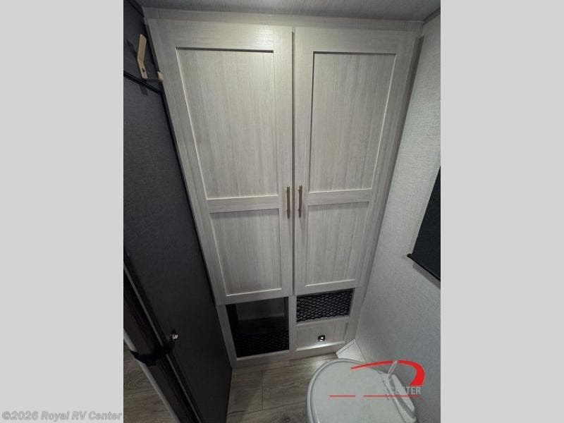 The full rear bathroom gives you room to move—something you don’t always find in a travel trailer this size. A large linen closet keeps towels and toiletries organized, while the thoughtful layout makes daily routines easy whether you’re at a campground or off-grid.