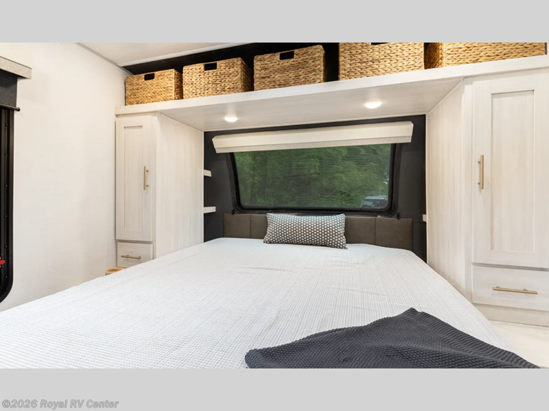 This travel trailer's functional rear kitchen boasts an air fryer/microwave that combines convenience for quick and healthy meal preparation, a shelf, overhead cabinets offering ample storage for culinary supplies and travel items, a fridge, and a pantry that delivers convenient storage for snacks and provisions. Plus, the bar 2 table creates a flexible space for casual dining and socializing, and the flip-up window enhances ventilation and brings in natural light for a bright kitchen ambiance. You can also rest a bit in the theater seating that provides comfortable, cinematic-style seating for relaxation. In the center of this RV, you will find a walk-through bathroom, adding convenience to the unit, and further, you will be mesmerized by the well-appointed front bedroom. Designed for two, this space offers a king-size bed, end tables, and a wardrobe on each side of the bed, featuring ample storage and convenient bedside spaces for comfort and organization.