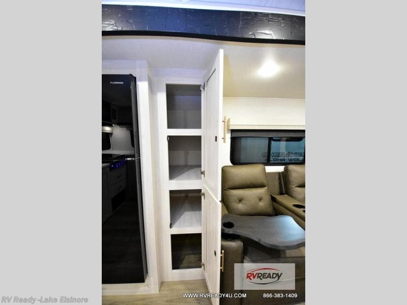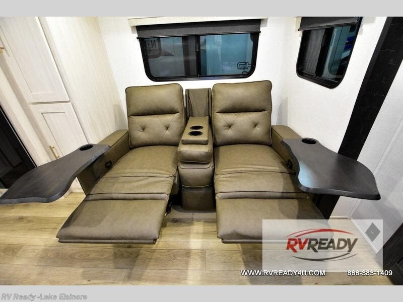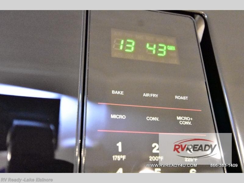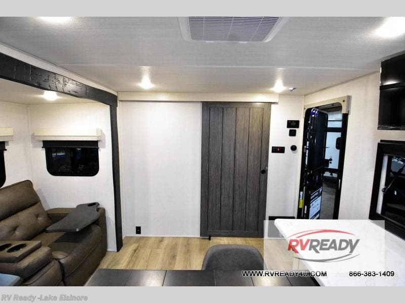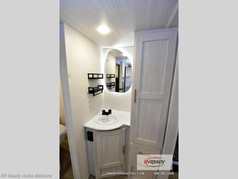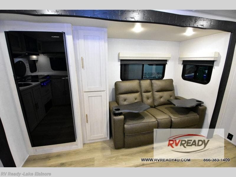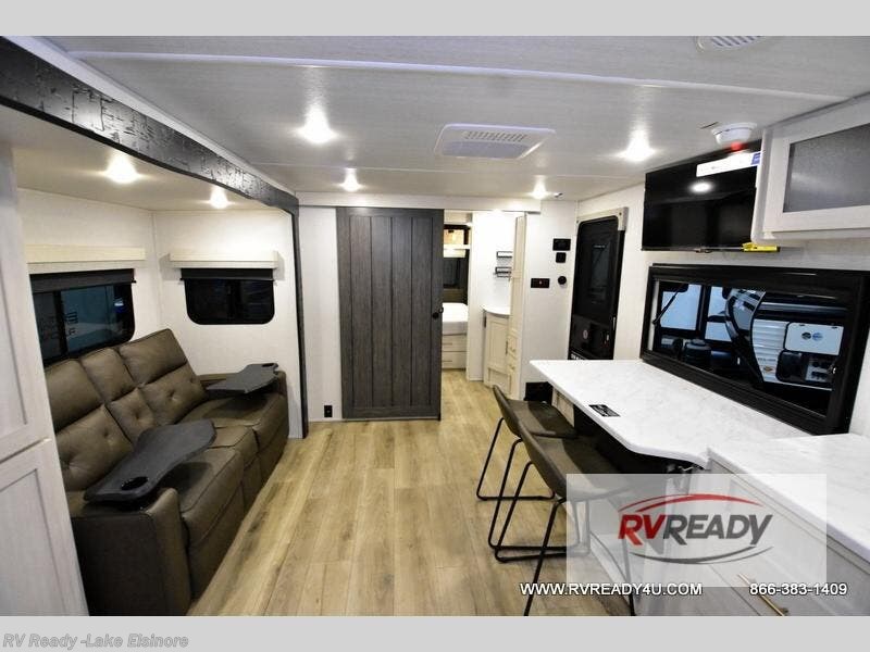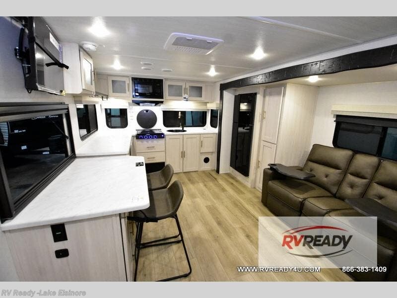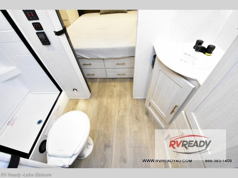 This travel trailer's functional rear kitchen boasts an air fryer/microwave that combines convenience for quick and healthy meal preparation, a shelf, overhead cabinets offering ample storage for culinary supplies and travel items, a fridge, and a pantry that delivers convenient storage for snacks and provisions. Plus, the bar 2 table creates a flexible space for casual dining and socializing, and the flip-up window enhances ventilation and brings in natural light for a bright kitchen ambiance. You can also rest a bit in the theater seating that provides comfortable, cinematic-style seating for relaxation. In the center of this RV, you will find a walk-through bathroom, adding convenience to the unit, and further, you will be mesmerized by the well-appointed front bedroom. Designed for two, this space offers a king-size bed, end tables, and a wardrobe on each side of the bed, featuring ample storage and convenient bedside spaces for comfort and organization.