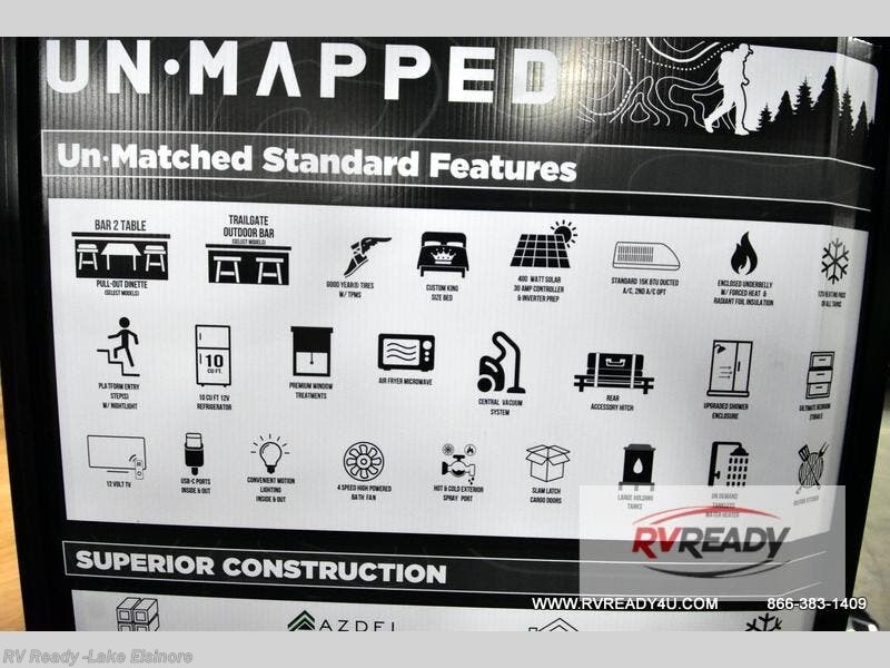 The Forest River Un-Mapped travel trailers deliver an unparalleled travel experience thanks to their incredible features, starting with the aluminum-framed floor with block foam insulation that ensures exceptional structural integrity and thermal efficiency, along with the sealed underbelly with forced heat & radiant foil barrier that provides superior insulation and heat management, and the power tongue jack facilitates easy maneuvering and stabilization of the trailer. Plus, the 30 Amp charge controller with solar inverter prep is ready for integration with solar power systems, catering to eco-conscious travelers seeking off-grid capabilities. Inside, you will find seamless Surf-X kitchen countertops that offer a sleek, durable surface and are easy to maintain for busy travelers. Further, the blackout roller shades will add privacy and light control for restful nights and cozy daytime retreats.