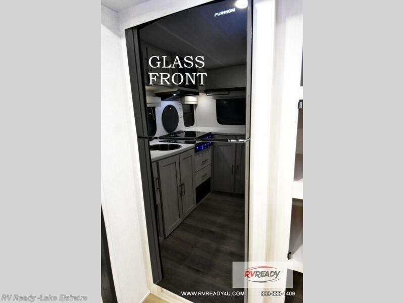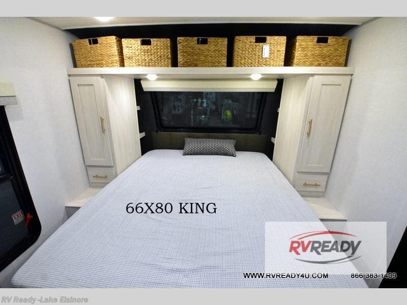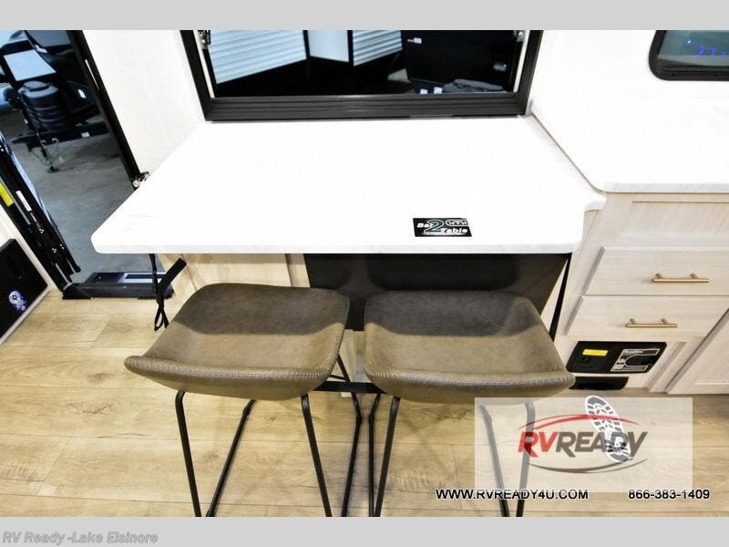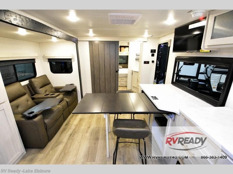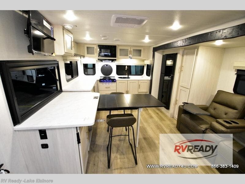 This travel trailer's functional rear kitchen boasts an air fryer/microwave that combines convenience for quick and healthy meal preparation, a shelf, overhead cabinets offering ample storage for culinary supplies and travel items, a fridge, and a pantry that delivers convenient storage for snacks and provisions. Plus, the bar 2 table creates a flexible space for casual dining and socializing, and the flip-up window enhances ventilation and brings in natural light for a bright kitchen ambiance. You can also rest a bit in the theater seating that provides comfortable, cinematic-style seating for relaxation. In the center of this RV, you will find a walk-through bathroom, adding convenience to the unit, and further, you will be mesmerized by the well-appointed front bedroom. Designed for two, this space offers a king-size bed, end tables, and a wardrobe on each side of the bed, featuring ample storage and convenient bedside spaces for comfort and organization.