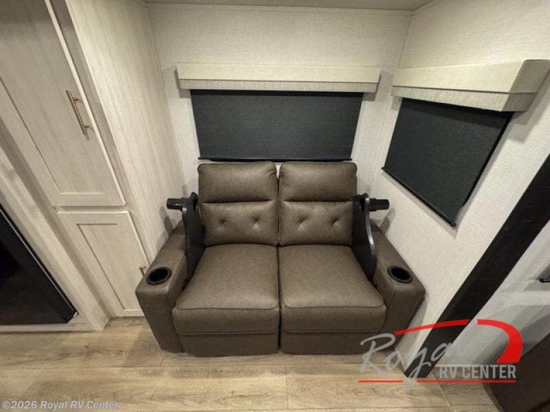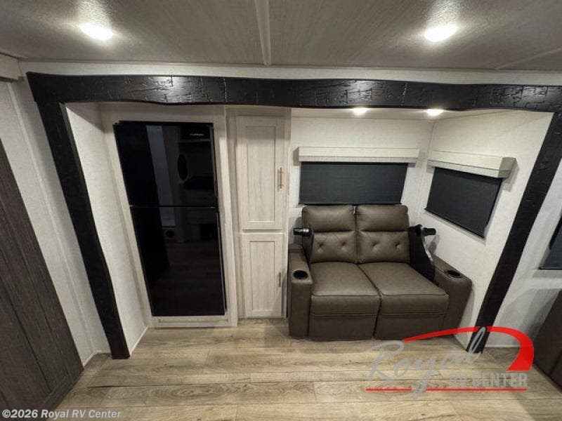 This travel trailer offers a comfortable and convenient layout rear bathroom with a linen closet, a private, well-appointed space for personal care with storage for linens, ensuring comfort on every journey. In the living room/kitchen combined area, you will find theater seating, a tri-fold sofa that offers versatile seating and additional space for guests or relaxation, adaptable to your travel needs, a fridge, a pantry for culinary supplies, an air fryer /microwave, a flip-up window, and overhead cabinets. The front bedroom will be your sanctuary of relaxation after a long day of exploring. The outside kitchen is the cherry on top, since it is ideal for alfresco cooking and dining, perfect for savoring meals amidst scenic surroundings and enjoying the outdoors with loved ones!