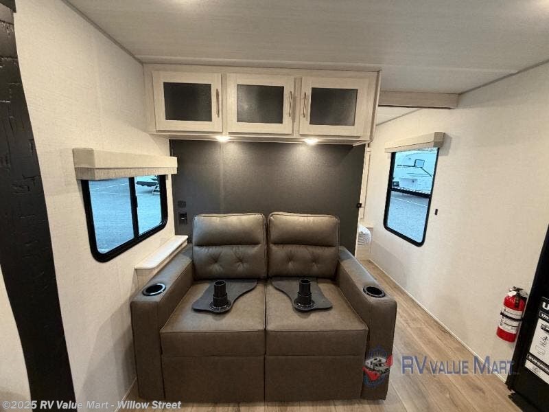 This travel trailer offers a comfortable and convenient layout rear bathroom with a linen closet, a private, well-appointed space for personal care with storage for linens, ensuring comfort on every journey. In the living room/kitchen combined area, you will find theater seating, a tri-fold sofa that offers versatile seating and additional space for guests or relaxation, adaptable to your travel needs, a fridge, a pantry for culinary supplies, an air fryer /microwave, a flip-up window, and overhead cabinets. The front bedroom will be your sanctuary of relaxation after a long day of exploring. The outside kitchen is the cherry on top, since it is ideal for alfresco cooking and dining, perfect for savoring meals amidst scenic surroundings and enjoying the outdoors with loved ones!