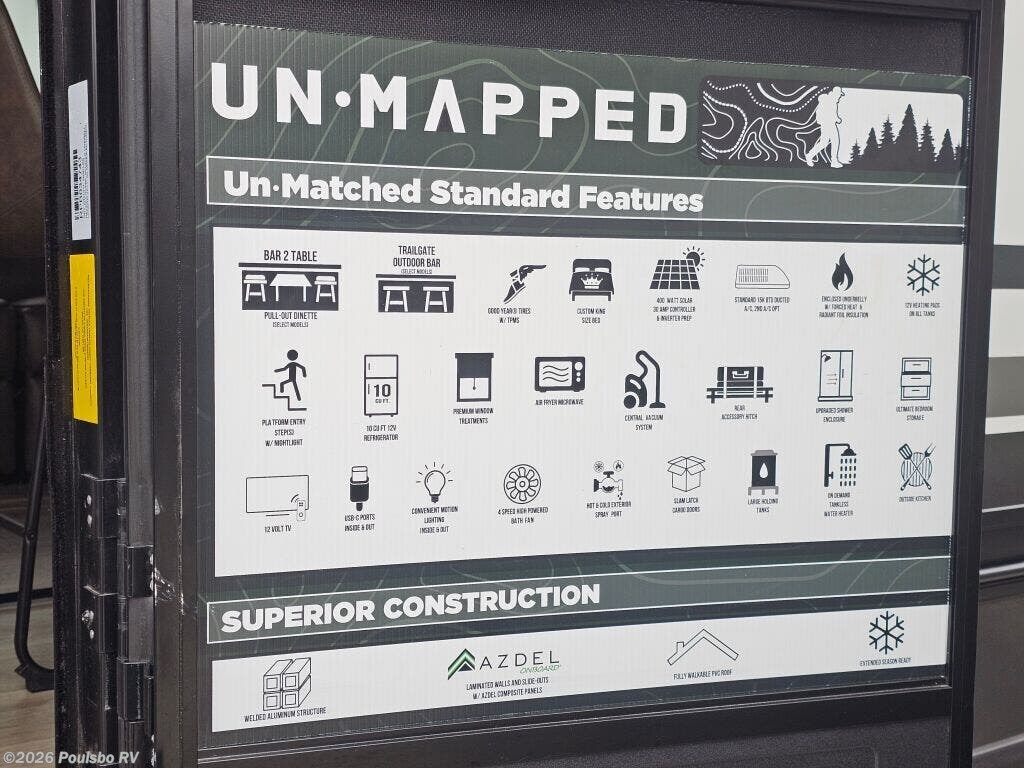 The 2026 Forest River Unmapped 22RB is a new travel trailer designed to enhance your adventures with comfort and style. Measuring 27 feet and 11 inches in length, this model offers a spacious living area that welcomes you with practical features and flexible accommodations. Ideal for couples or small families, it comfortably sleeps two while providing a versatile space to relax, dine, and unwind. This unit includes one slide out that expands the interior living quarters, offering extra room for everyday comfort and convenience. With one awning, you can enjoy outdoor shade and protection, making your campsite feel like a second living room. The Forest River Unmapped 22RB comes equipped with leveling jacks, ensuring stability wherever your travels take you, and delivers hitch weight of 640 pounds for easy towing. Its dry weight of 5693 pounds makes it manageable for many tow vehicles, helping you hit the road with confidence. The thoughtfully designed interior prioritizes livability and ease of use, letting you focus on exploring new places and creating unforgettable memories. This model stands as a testament to quality and functionality, built to meet the needs of passionate RVers looking for dependable and stylish accommodations. As a family-owned, award-winning local RV dealer with multiple locations in Sumner, Everett, Kent, and Mt. Vernon Washington, Poulsbo RV here to help you find the perfect RV. Stock#: S912, VIN: 4X4TRPX28TB034743.