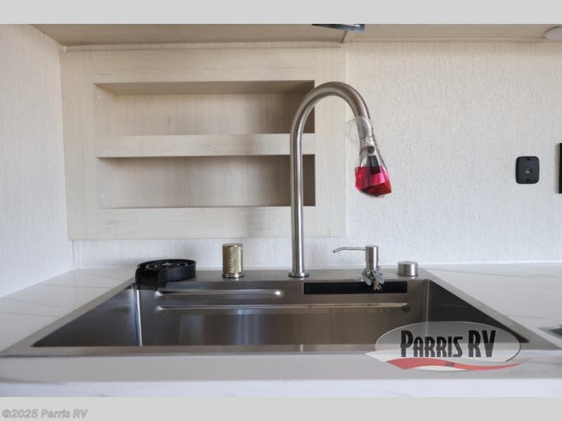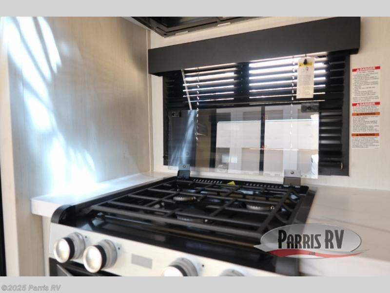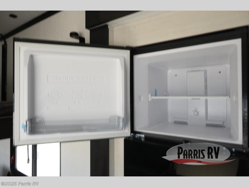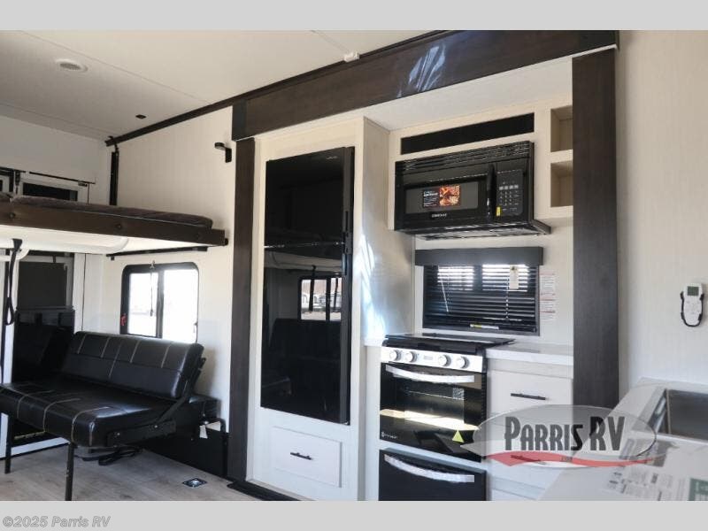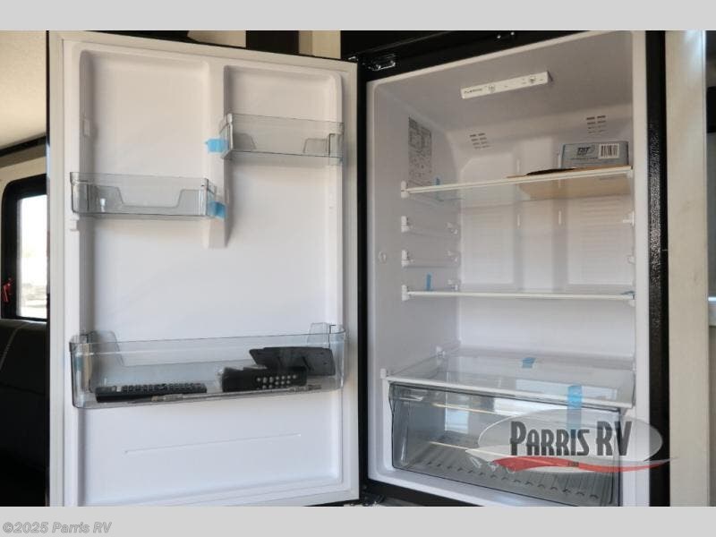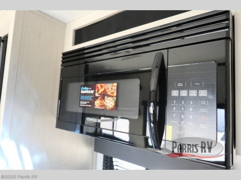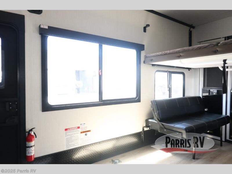 This double slide out toy hauler is ready for adventure when you are! Once your toys are unloaded using the ramp door, you can set up the flip-up sofas or set up the drop-down queen bed for guests to sleep on. You'll enjoy the front private bedroom all to yourselves that includes a king bed slide and a large dresser to keep your things organized. A three burner range and 30" microwave will let you make meals each day, and the 10.7 cu. ft. 12V refrigerator will keep your food stored away.