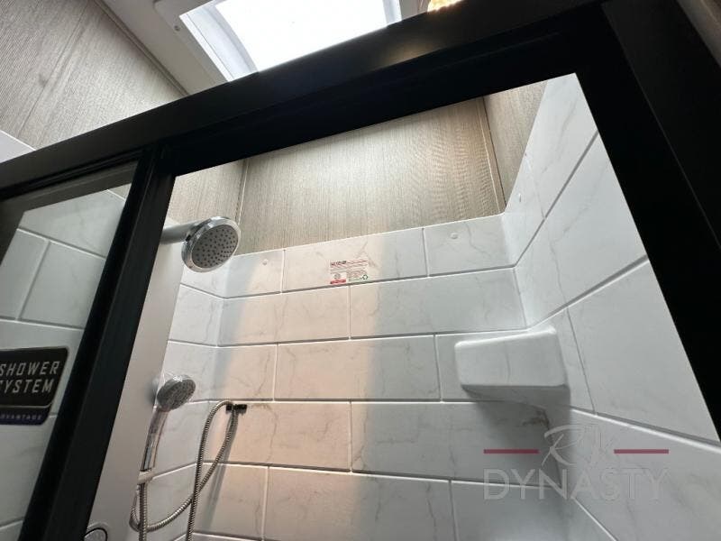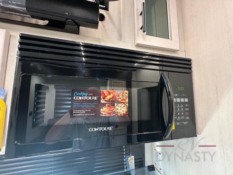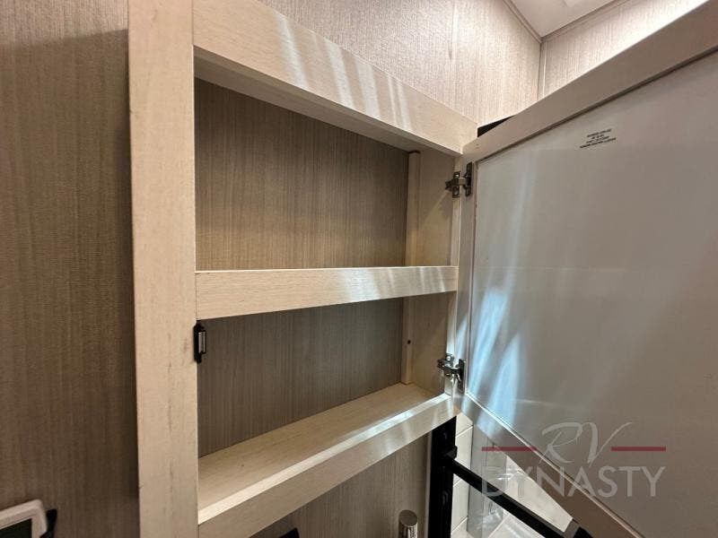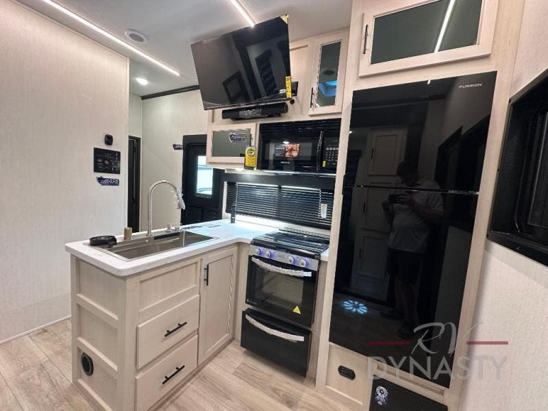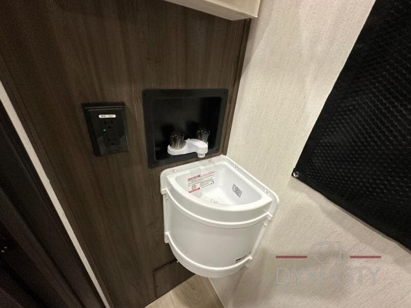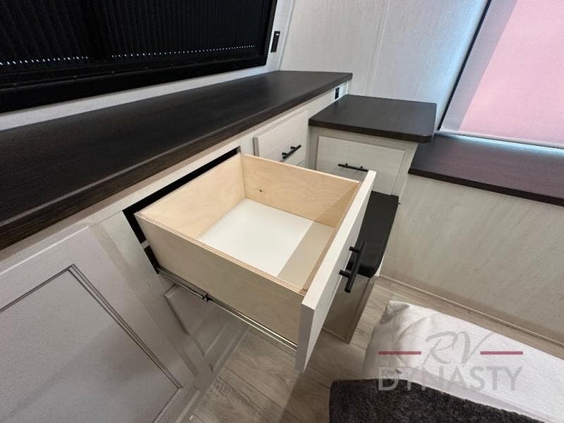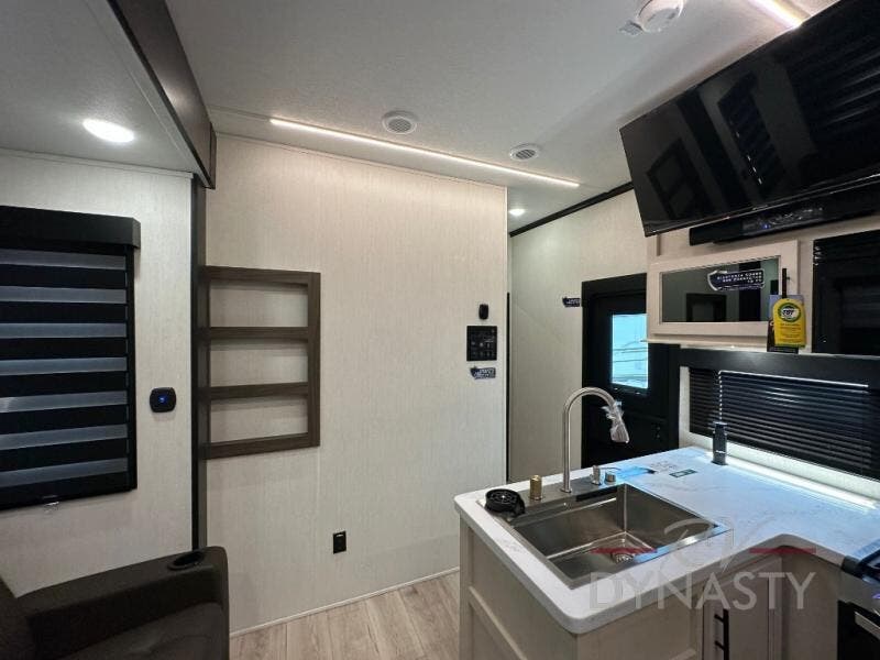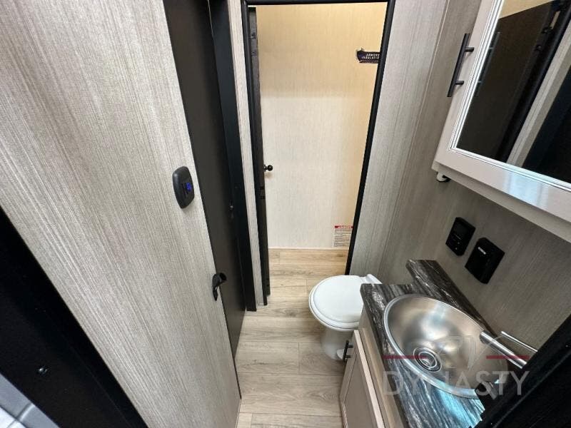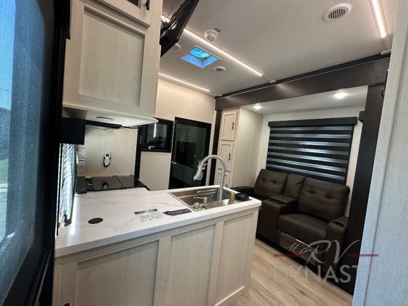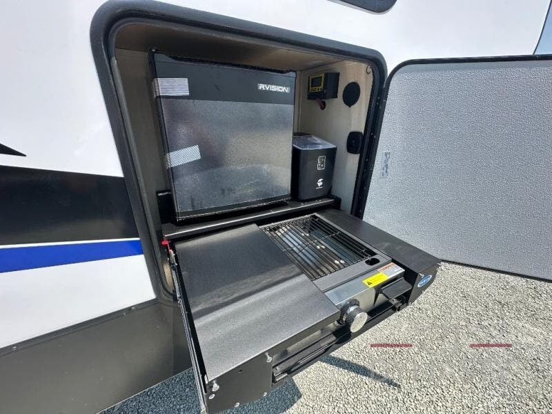 This double slide out toy hauler is ready for adventure when you are! Once your toys are unloaded from the separate garage, you can set up the flip-up sofas or set up the drop-down queen bed for guests to sleep on, and there is even a half bath here for added convenience. You'll enjoy the front private bedroom all to yourselves that includes a king bed slide and a large dresser to keep your things organized. The combined kitchen and living area includes a three burner range and 30" microwave to make meals, a sofa with recliners to relax on, plus a 12V refrigerator and pantry for food storage.