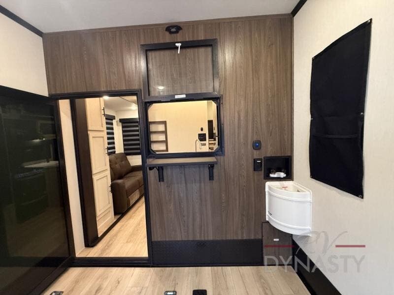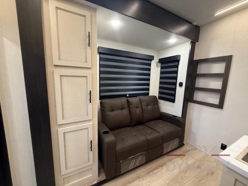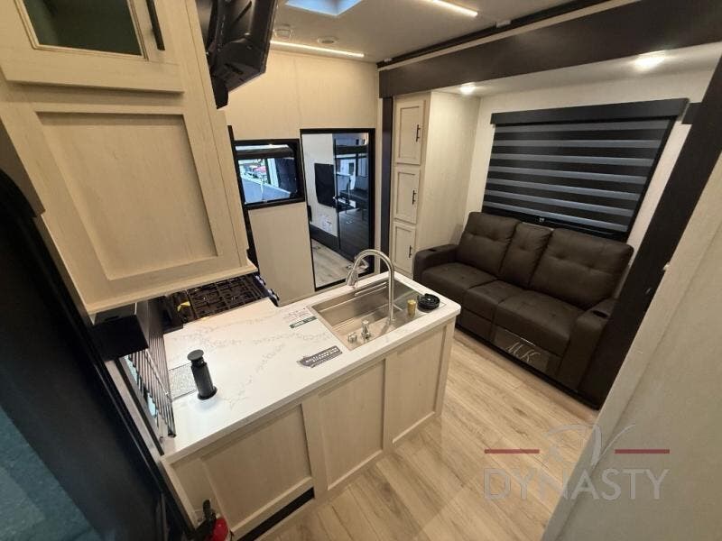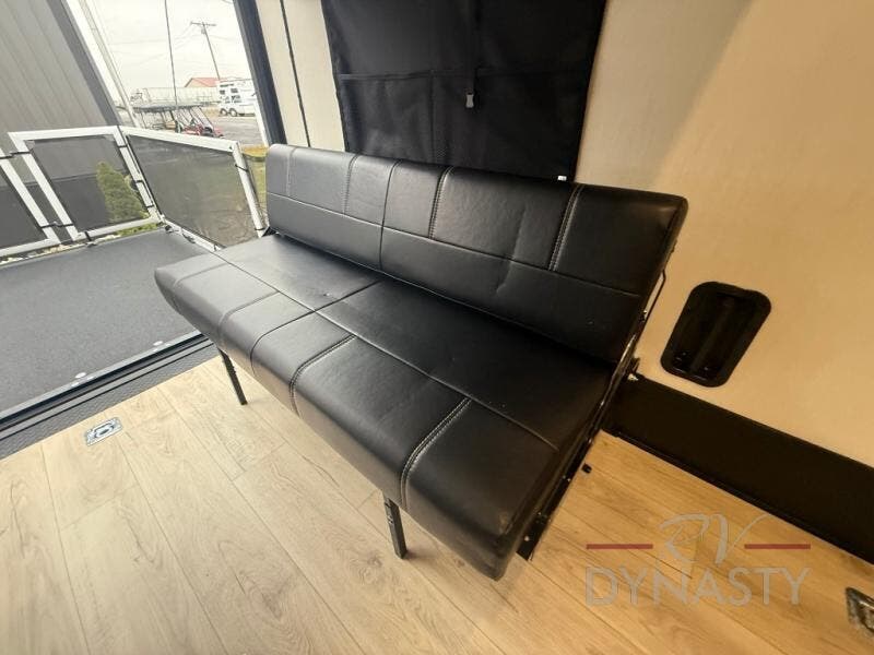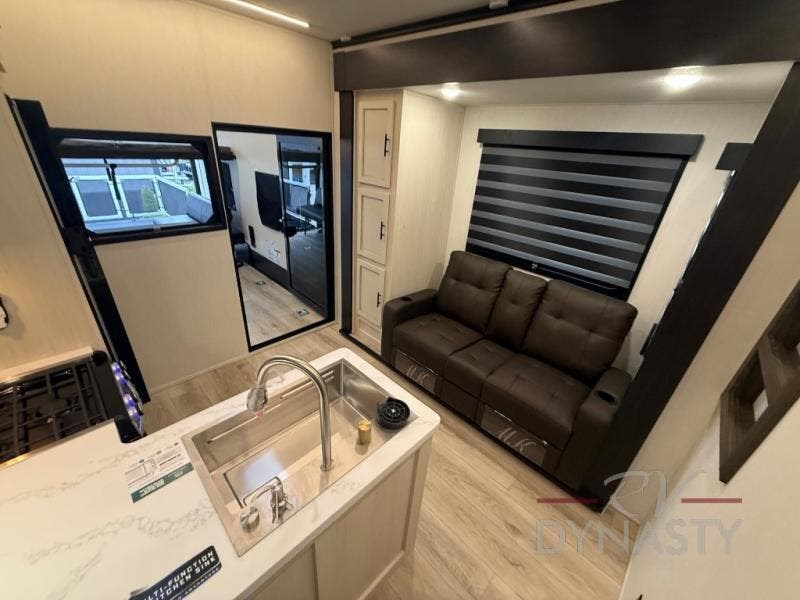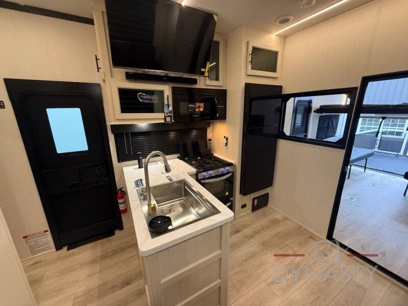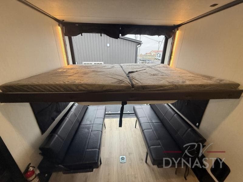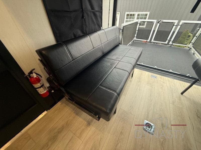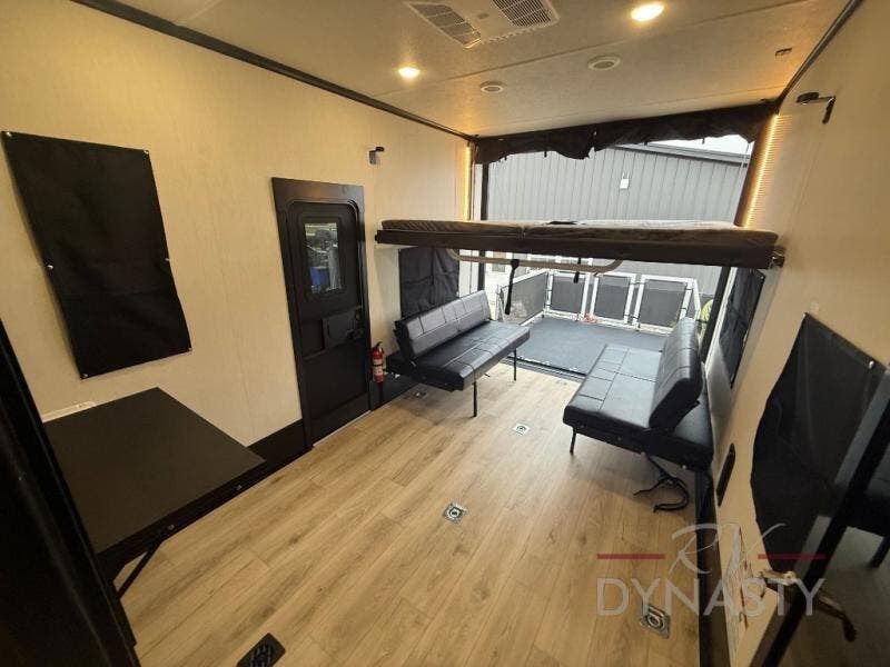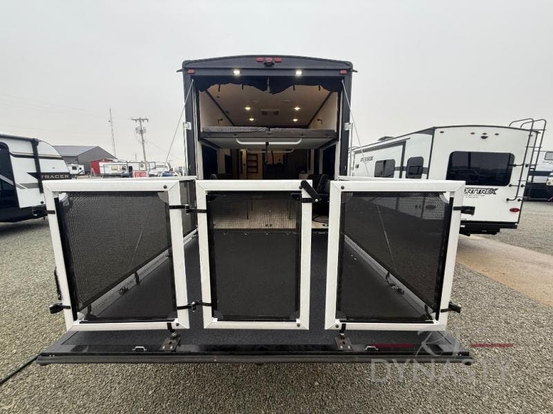 This double slide out toy hauler is ready for adventure when you are! Once your toys are unloaded from the separate garage, you can set up the flip-up sofas or set up the drop-down queen bed for guests to sleep on, and there is even a half bath here for added convenience. You'll enjoy the front private bedroom all to yourselves that includes a king bed slide and a large dresser to keep your things organized. The combined kitchen and living area includes a three-burner range and 30" microwave to make meals, a sofa with recliners to relax on, plus a 12V refrigerator and pantry for food storage.
