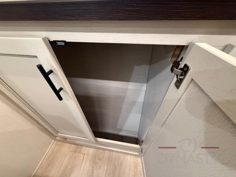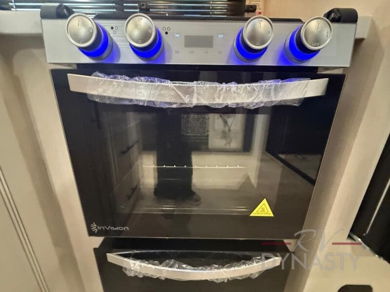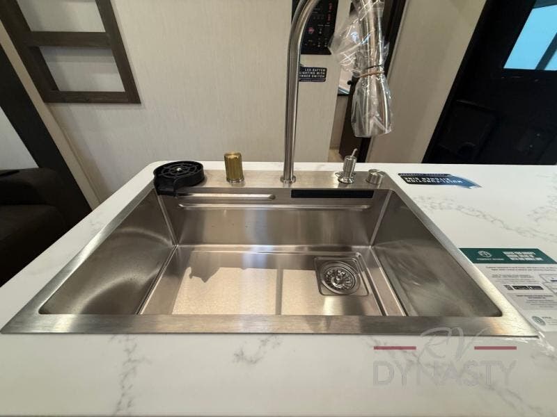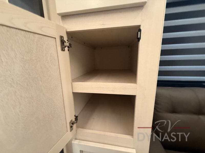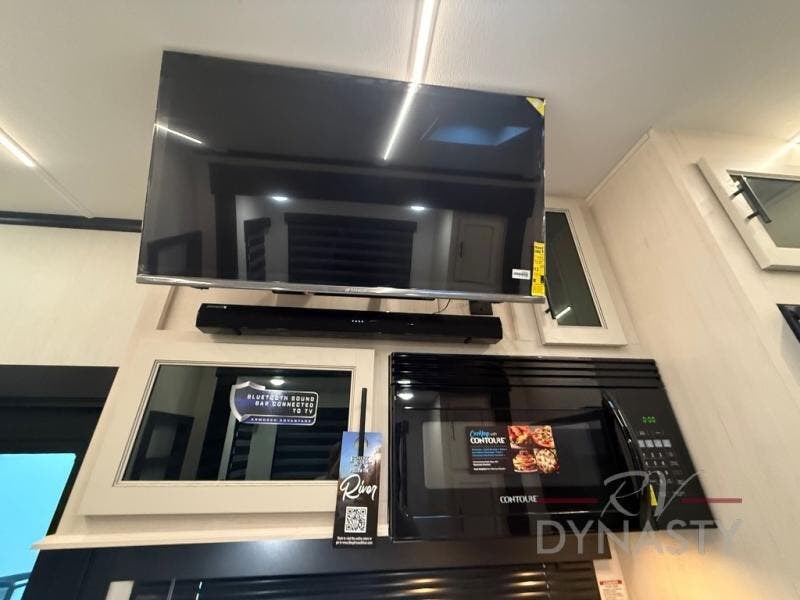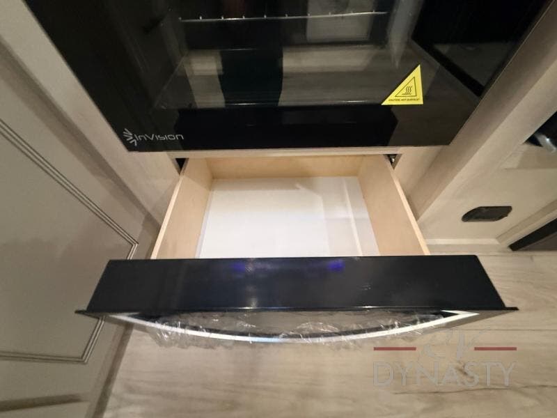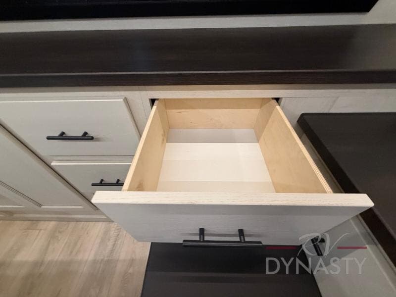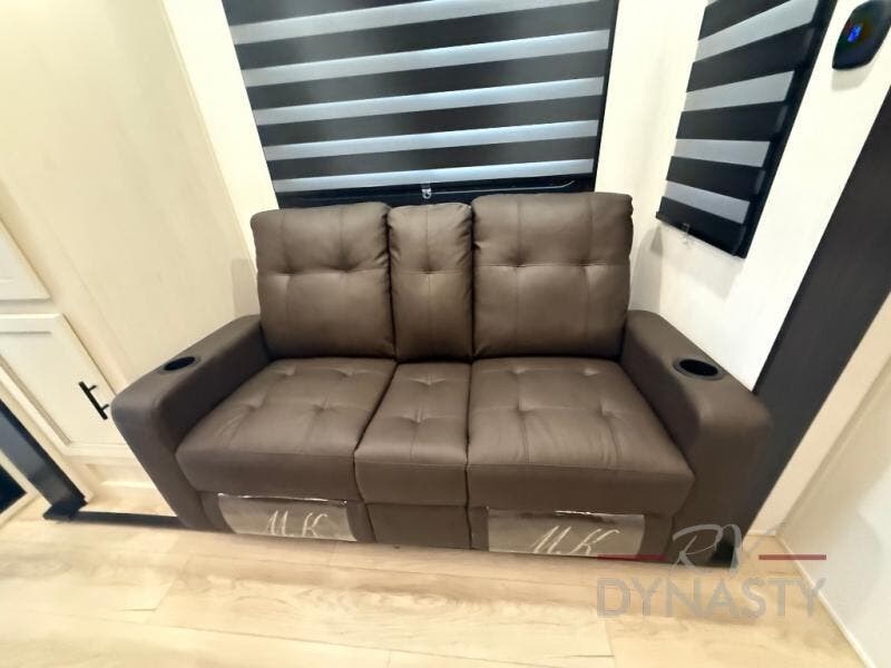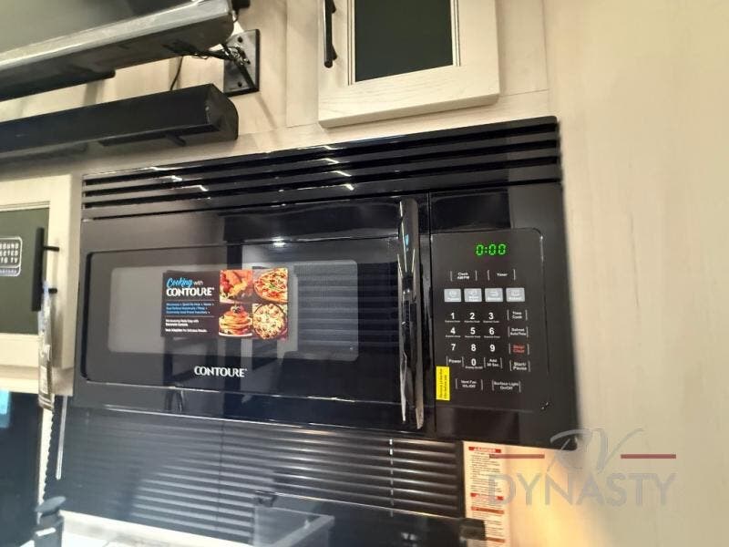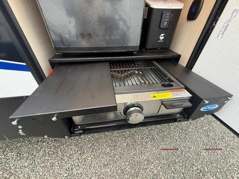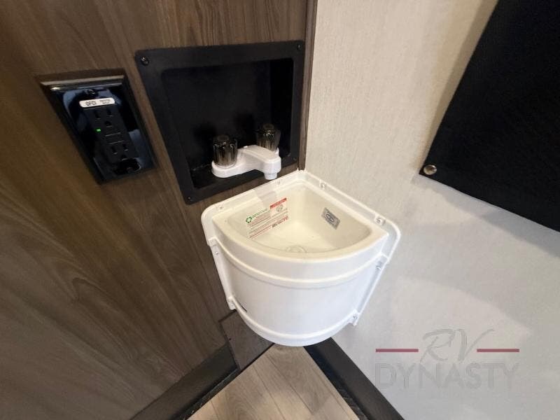 This double slide out toy hauler is ready for adventure when you are! Once your toys are unloaded from the separate garage, you can set up the flip-up sofas or set up the drop-down queen bed for guests to sleep on, and there is even a half bath here for added convenience. You'll enjoy the front private bedroom all to yourselves that includes a king bed slide and a large dresser to keep your things organized. The combined kitchen and living area includes a three-burner range and 30" microwave to make meals, a sofa with recliners to relax on, plus a 12V refrigerator and pantry for food storage.