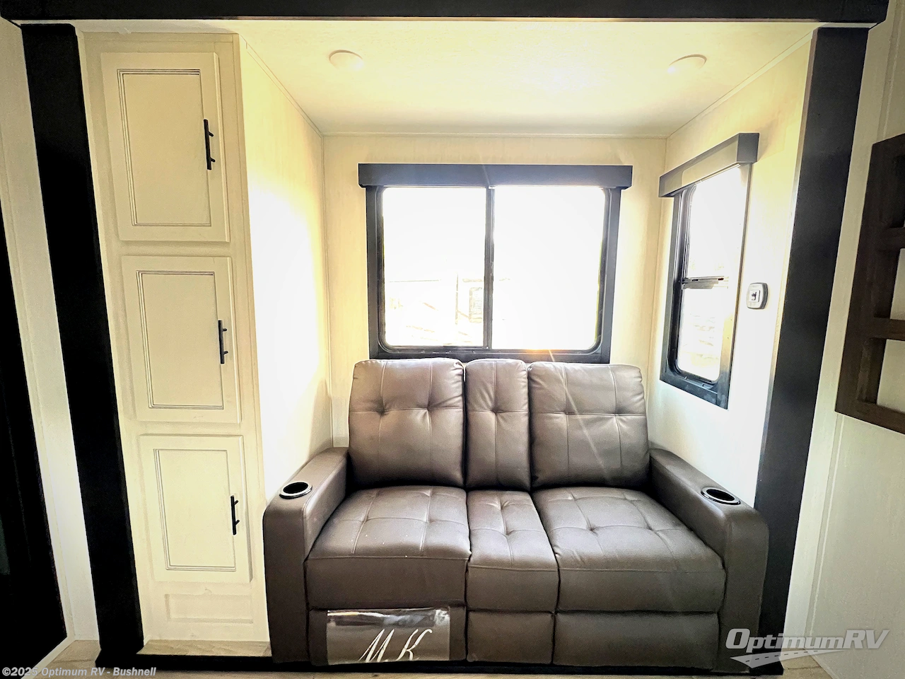 This double slide out toy hauler is ready for adventure when you are! Once your toys are unloaded from the separate garage, you can set up the flip-up sofas or set up the drop-down queen bed for guests to sleep on, and there is even a half bath here for added convenience. You'll enjoy the front private bedroom all to yourselves that includes a king bed slide and a large dresser to keep your things organized. The combined kitchen and living area includes a three-burner range and 30" microwave to make meals, a sofa with recliners to relax on, plus a 12V refrigerator and pantry for food storage.