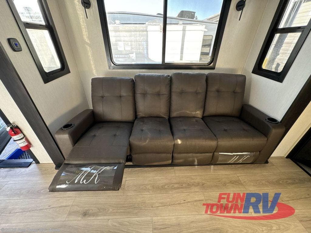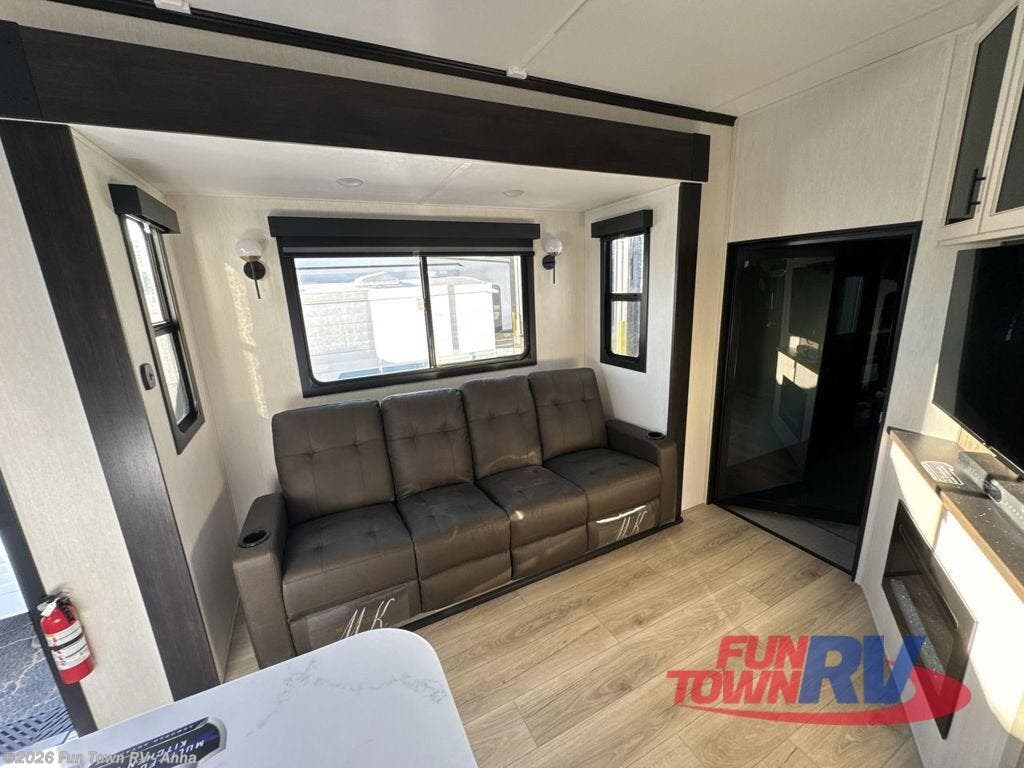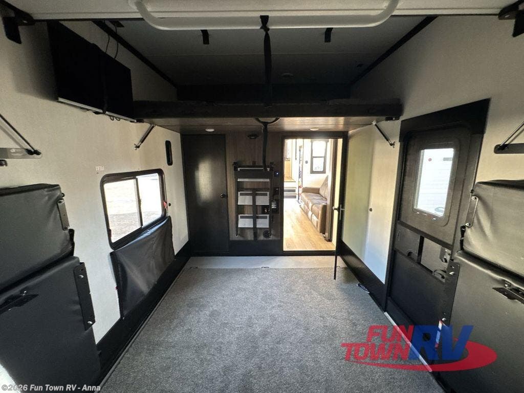 There is ample space in this triple slide out toy hauler for toys, gear, friends and more! The front private bedroom has a king bed slide to lay your head on at night, a front wall wardrobe, a dresser to keep your clothes looking nice, plus an entrance into the bathroom. The kitchen has a counter peninsula to prepare your meals, and a 12V glass residential-style refrigerator to store any leftovers. The garage area has a loft, opposing flip-up sofas with a table in between and a raised queen bed above them, as well as a second entry door. And the half bath/utility bath is an extra bonus when camping with friends!