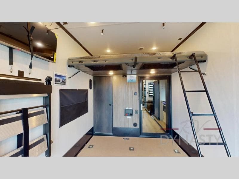 The 15' 6" garage area of this fifth wheel toy hauler has enough space for you to bring along your favorite off-road toys! The garage area also has opposing flip-up sofas with a table in between and a raised queen bed above, plus a loft and a half bath/utility bath. There is plenty of interior space in the central combined living/kitchen area thanks to the large slide out sofa with recliners, as well as the refrigerator and three burner cooktop slide. The front dual entry bathroom has a radius shower for you to freshen up in each morning and an entrance into a private bedroom with king bed and lots of storage!