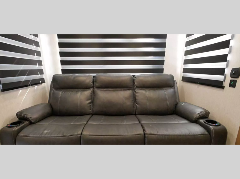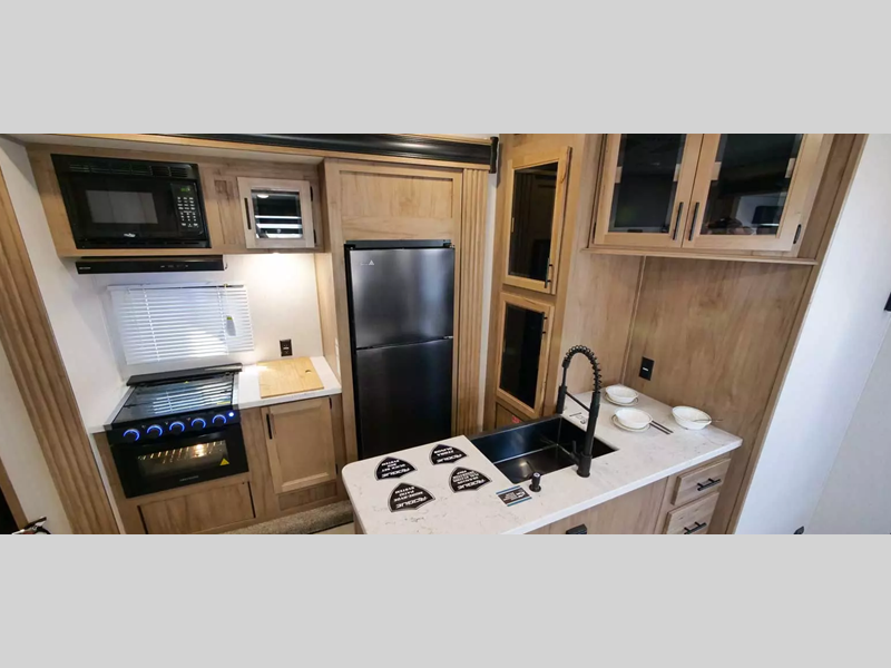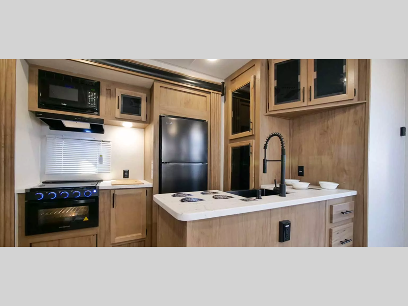 With any Vengeance Rouge SUT toy hauler travel trailer or fifth wheel by Forest River you can bring along your favorite ride-on toys, while still enjoying at-home comforts. Each one is built with a seamless roofing membrane with heat reflectivity and an armored underbelly tank enclosure for added strength and durability, and the 8' 6" wide body construction means you can bring along your favorite ride-on toys. Inside, you'll find a 1000 watt microwave and a three burner cooktop with an oven, seamless countertops, plus zebra shades that filters light and are blackout capable. These toy haulers also include 12V heat pads on all the holding tanks, a 15,000 BTU A/C unit, and many more amenities to make camping easier than ever.