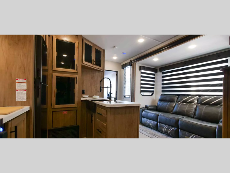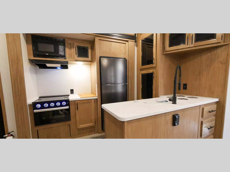 The bath and a half and separate garage in this toy hauler make it the perfect model to camp with friends or family. Your guests will have two roll-over sofas and a quick set queen bed system to sleep on plus their own half bath and private entry door. You'll enjoy the Rouge king bed in the front master bedroom, along with dual wardrobes, and easy access into the dual entry bath! Everyone can meet in the main living area on the sofa slide out, and the opposing slide will create maximum space to relax. There is also an island peninsula in the kitchen, a three burner cooktop with an oven, and a 10 cu. ft. 12V high-efficiency residential refrigerator for food storage.