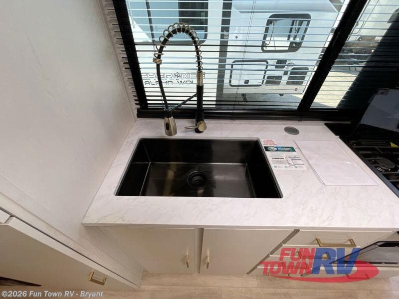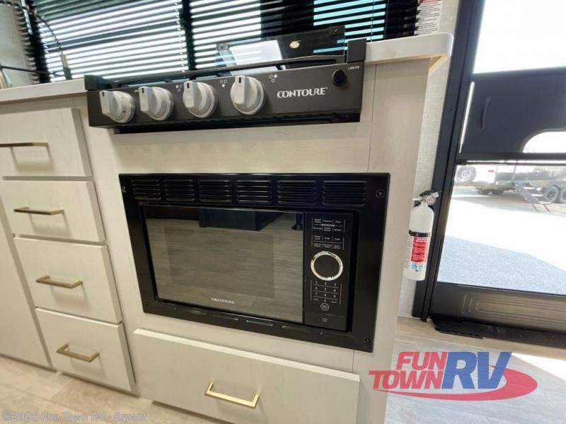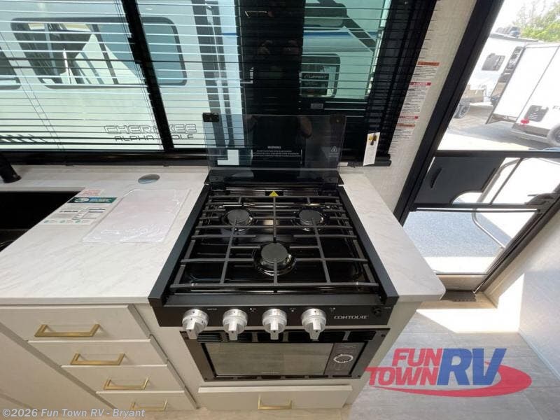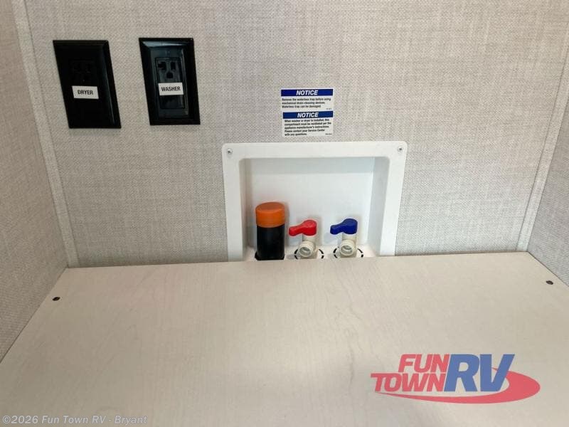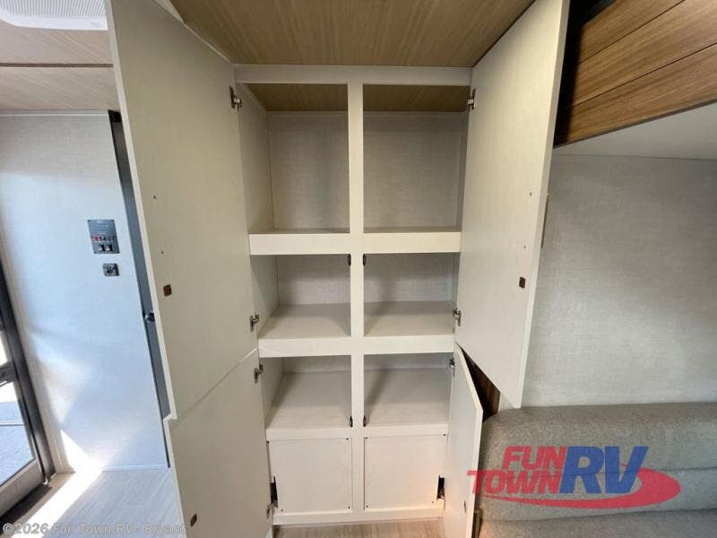 You will love camping every other weekend in this spacious travel trailer. There is a full rear bath with a spacious shower and linen closet for towels and toiletries. Your crew can get comfortable on the theater seating across from the entertainment center, and it even swings open to reveal hidden pantry storage. Easily prepare your meals in the kitchen on the three burner cooktop, or in the oven. There is also a 12V refrigerator, plus a microwave for meals on the go. When you're ready to call it a night, the front private bedroom is sure to provide comfort with its custom king bed, wardrobe, and underbed storage.