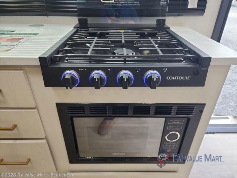 You will love camping every other weekend in this spacious travel trailer. There is a full rear bath with a spacious shower and linen closet for towels and toiletries. Your crew can get comfortable on the theater seating across from the entertainment center and fireplace. Easily prepare your meals in the kitchen on the three-burner cooktop, or in the oven. There is also a 12V refrigerator, plus a microwave for meals on the go. When you're ready to call it a night, the front private bedroom is sure to provide comfort with its custom king bed and generous storage space.