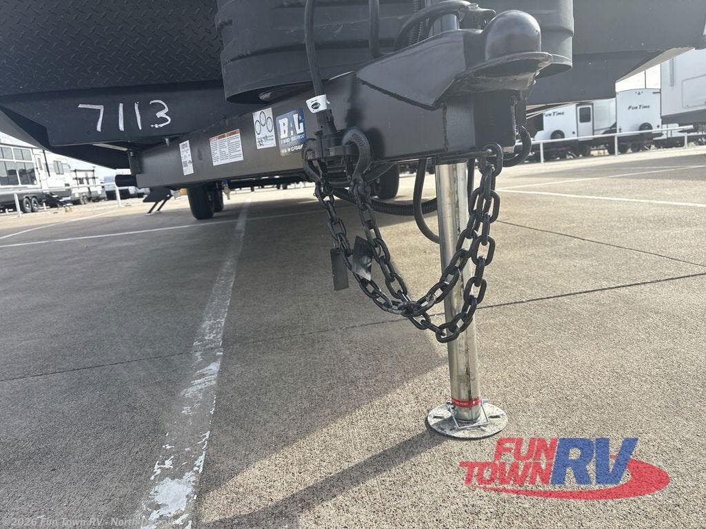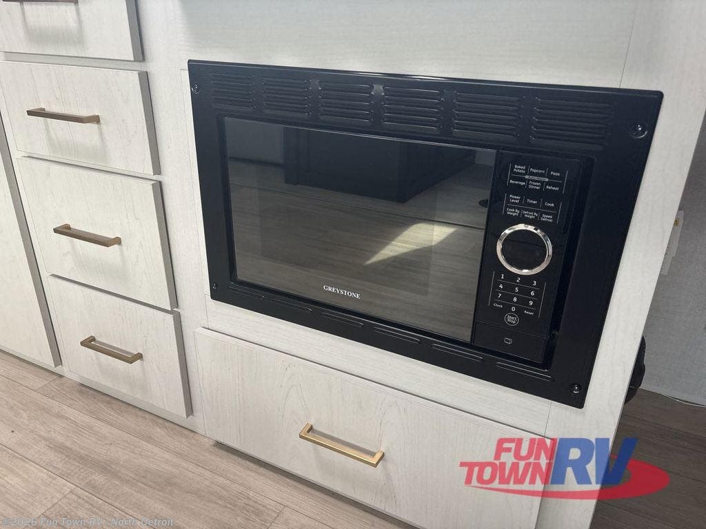 You will love camping every other weekend in this spacious travel trailer. There is a full rear bath with a spacious shower and linen closet for towels and toiletries. Your crew can get comfortable on the theater seating across from the entertainment center, and it even swings open to reveal hidden pantry storage. Easily prepare your meals in the kitchen on the three burner cooktop, or in the oven. There is also a 12V refrigerator, plus a microwave for meals on the go. When you're ready to call it a night, the front private bedroom is sure to provide comfort with its custom king bed, wardrobe, and underbed storage.