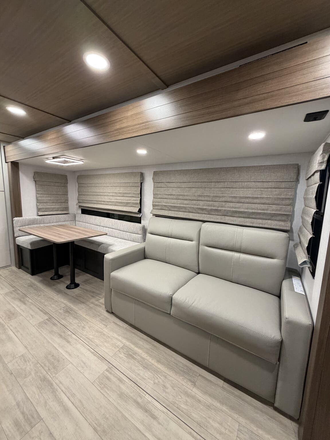 Dinette, Fireplace, King Size Bed, Overhead Cabinetry, Pantry, Pleated Shades, Recliner(s), Roof Vents, Shower, Sofa Bed, Toilet, Washer/Dryer Prep -