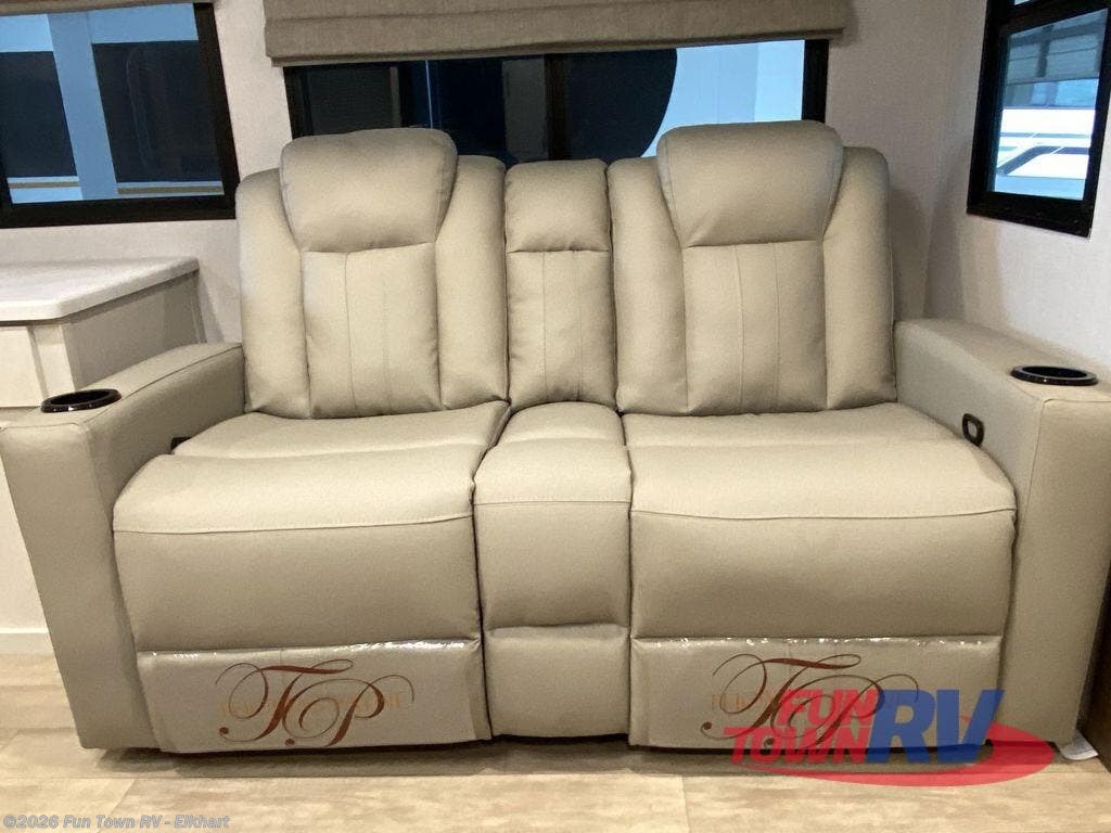 This travel trailer allows you to enjoy the great outdoors without having to give up your creature comforts. The dual opposing slides provide the chef space to work around the kitchen island, and there is plenty of seating space for your guests on the theater seating or the sleeper sofa, plus there's a desk area with chair so you can work on the go. The fireplace with a TV above will be perfect for those rainy days, and there is even a large skylight to let natural light into the living room. This model also includes Sure-Step entry steps, pass-through storage, plus two power awnings with LED lights so you can spend more time outdoors with friends and family!