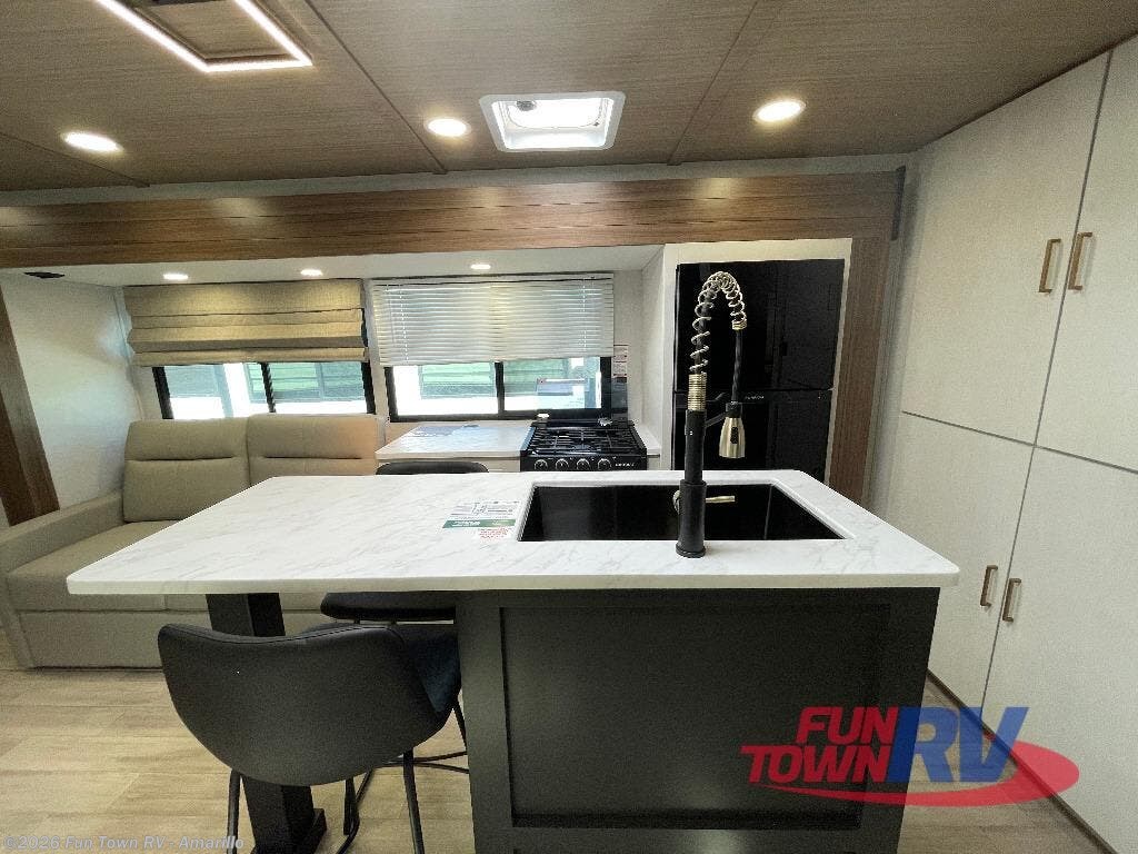 Whether you enjoy spending time outdoors or indoors, there is something for everyone in this travel trailer. The large pass-through storage can store your fishing poles, and the 20' electric awning with LED lights will create an outdoor living space. There is even an outdoor refrigerator with an outside storage cabinet and 32" TV! You will love all the interior space thanks to the dual opposing slides in the main living area, which will give the chef space to work around the kitchen island. Your crew can visit on the tri-fold sofa, theater seating and 5-person dinette while the fireplace is going, but you'll probably find the kids spending most of their time in the private bunkhouse! What more could you want in a travel trailer?!