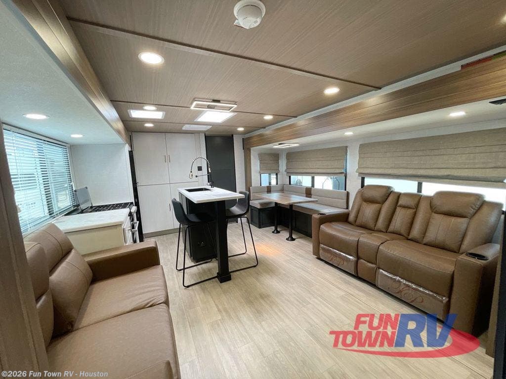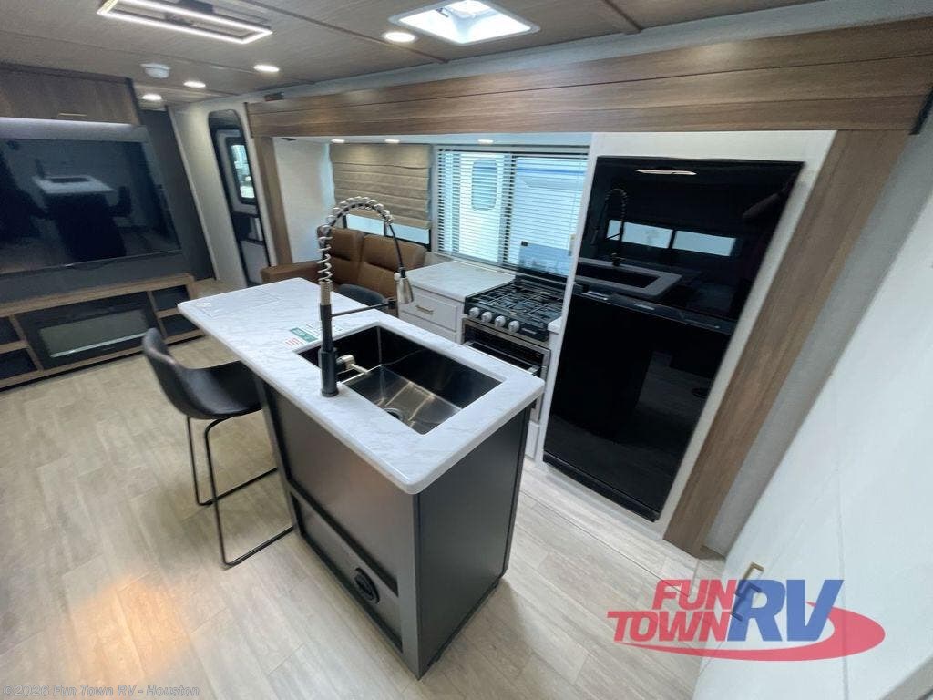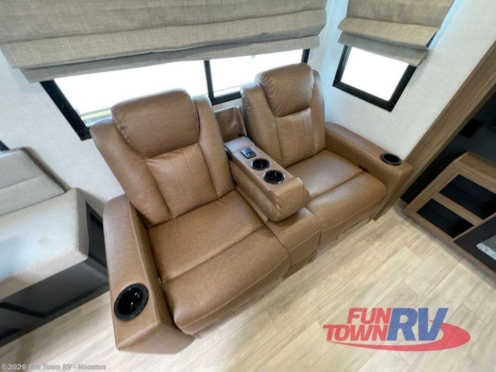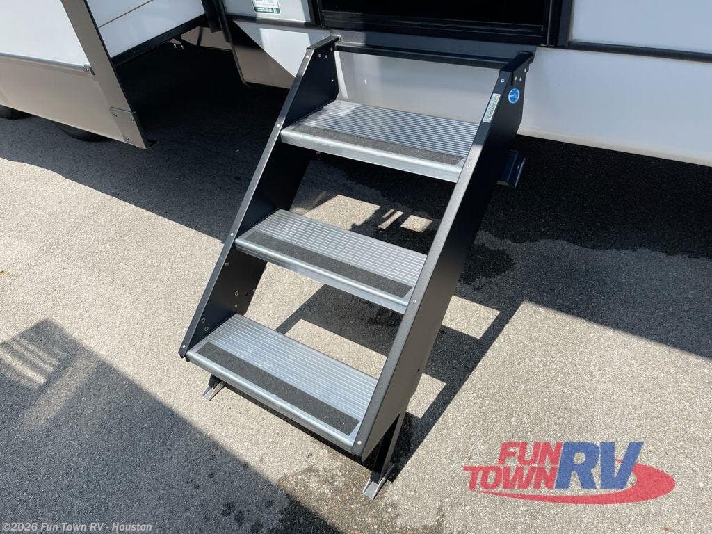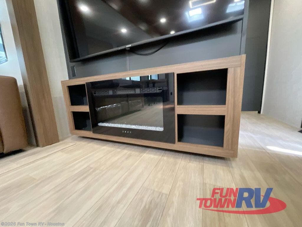 Whether you enjoy spending time outdoors or indoors, there is something for everyone in this travel trailer. The large pass-through storage can store your fishing poles, and the 20' electric awning with LED lights will create an outdoor living space. There is even an outdoor refrigerator with an outside storage cabinet and 32" TV! You will love all the interior space thanks to the dual opposing slides in the main living area, which will give the chef space to work around the kitchen island. Your crew can visit on the tri-fold sofa, theater seating and 5-person dinette while the fireplace is going, but you'll probably find the kids spending most of their time in the private bunkhouse! What more could you want in a travel trailer?!